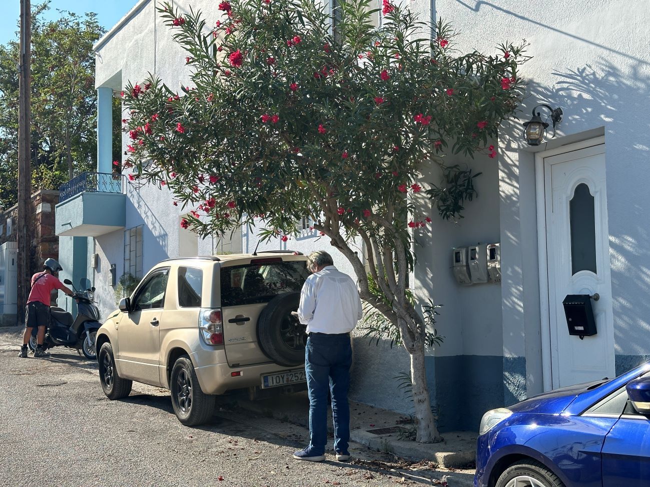 Απέναντι μας μια πικροδάφνη, που κλαδεύτηκε σε δένδρο, αριστερά μας η άκρως κατηφορική Σιδερή Πυλιαρού, δεξιά μας ένα ανηφορικό διάβα και απέναντι η μοναδική πολυκατοικία της Μεραρχίας Αρχιπελάγους.