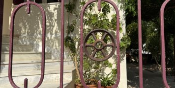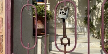 Αριστερά μας μια οβάλ οικία με ένα τεράστιο κισσό, δύο σπίτια απέναντι, το ένα υπό σκιάν, αντικρύζουν τους κάκτους στην είσοδο ενός σπιτιού, με έναν τετράποδο, τον λες και φύλακα και μια σύνθεση με μηχανικά εξαρτήματα στην καγκελόπορτα του.
