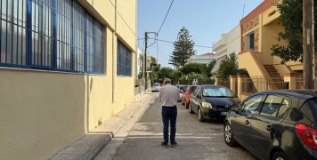 Δεξιά μας ένας κήπος με ζαρζαβατικά, αριστερά μας μια λεμονιά δίπλα σε μια ξεβαμμένη Ελληνική σημαία, μια οικία αριστερά μας σε πράσινα και καφέ χρώματα και απέναντι μας η οδός Ιατρού Ματθαίου Ζύμαρη.
