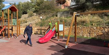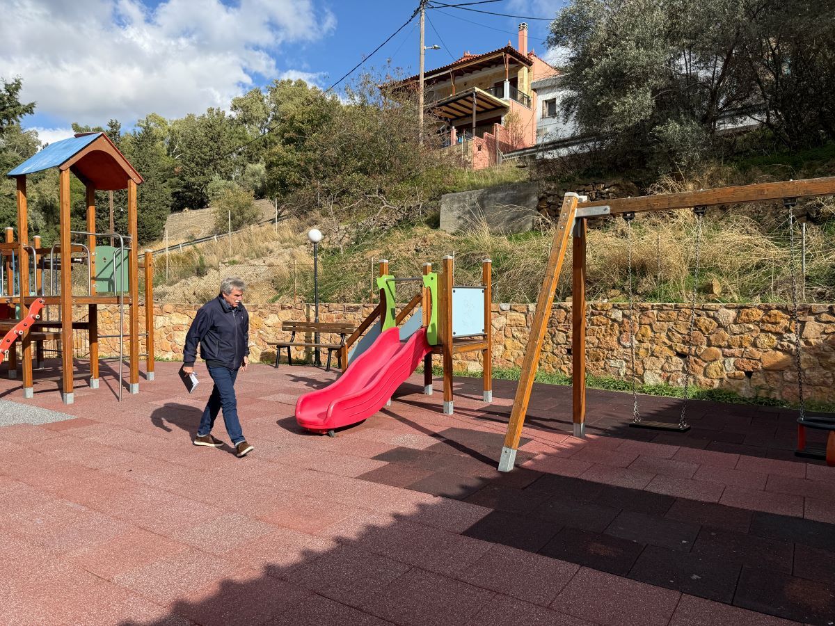Απέναντι από την πρώτη πινακίδα ονοματοθεσίας μια παιδική χαρά, με μια εγκατάσταση του Σώματος Ελληνικού Οδηγισμού, προστατευτικό πάτωμα, κούνιες και ένα παγκάκι για επιτήρηση των παιδιών, αν υπάρχουν στην περιοχή.