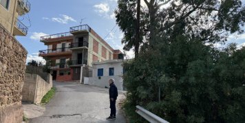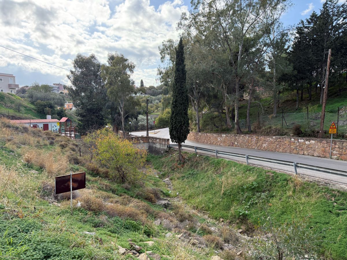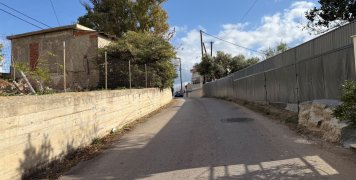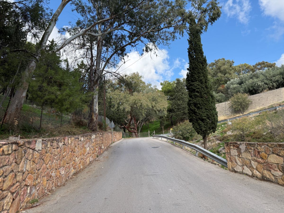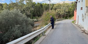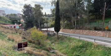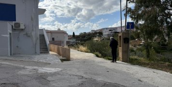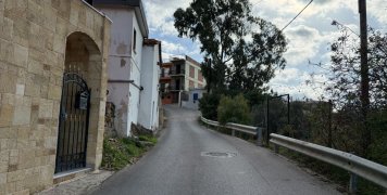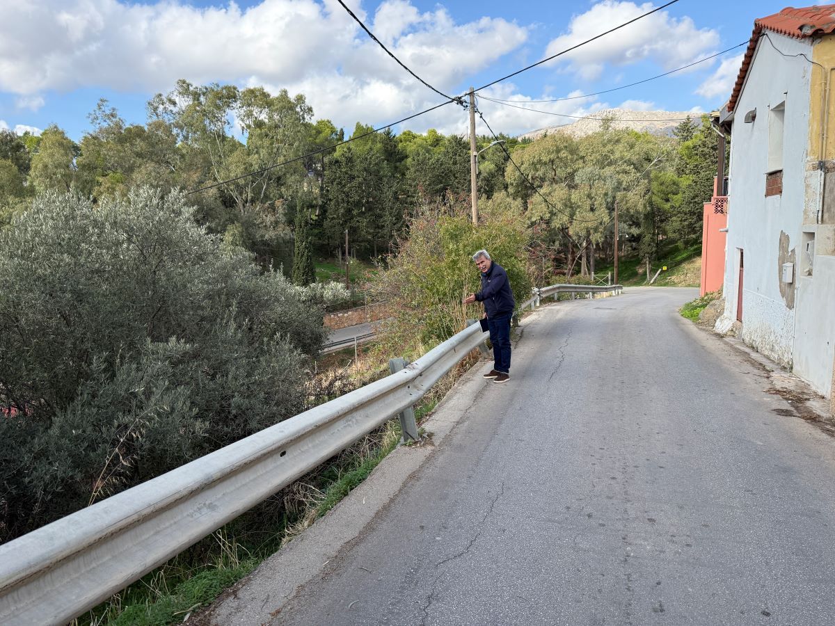 Μια διώροφη οικία με ένα γκαράζ στο ισόγειο και εδώ ο δρόμος στενεύει, έχοντας από την εξωτερική πλευρά του μια μεταλλική προστατευτική μπάρα, πάντα από το γεμάτο πάντα σκουπίδια ρέμα.