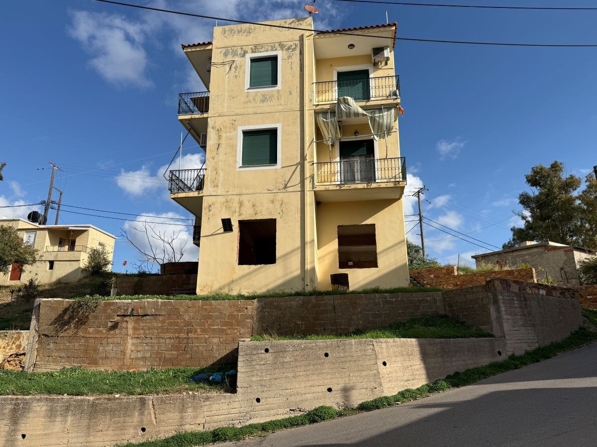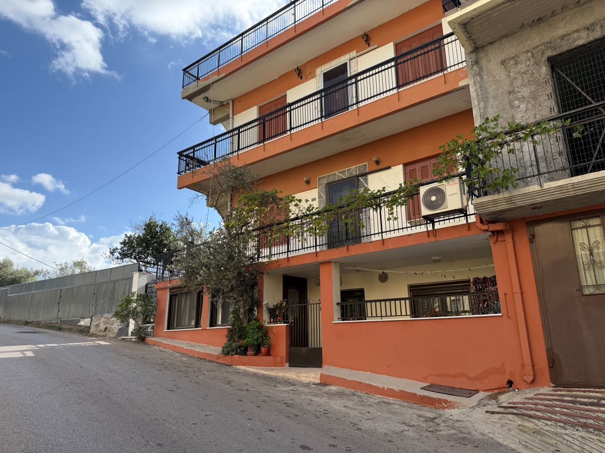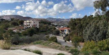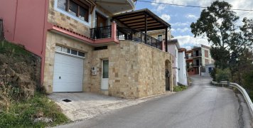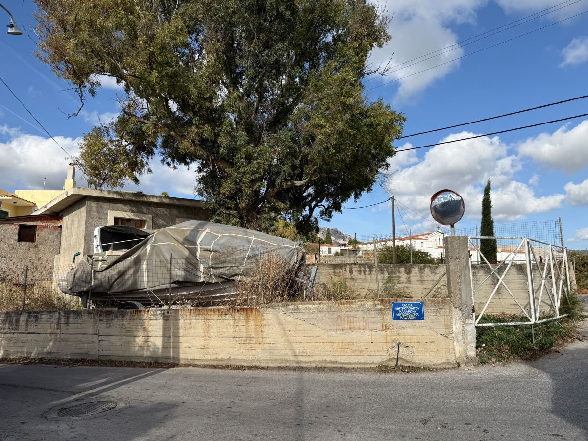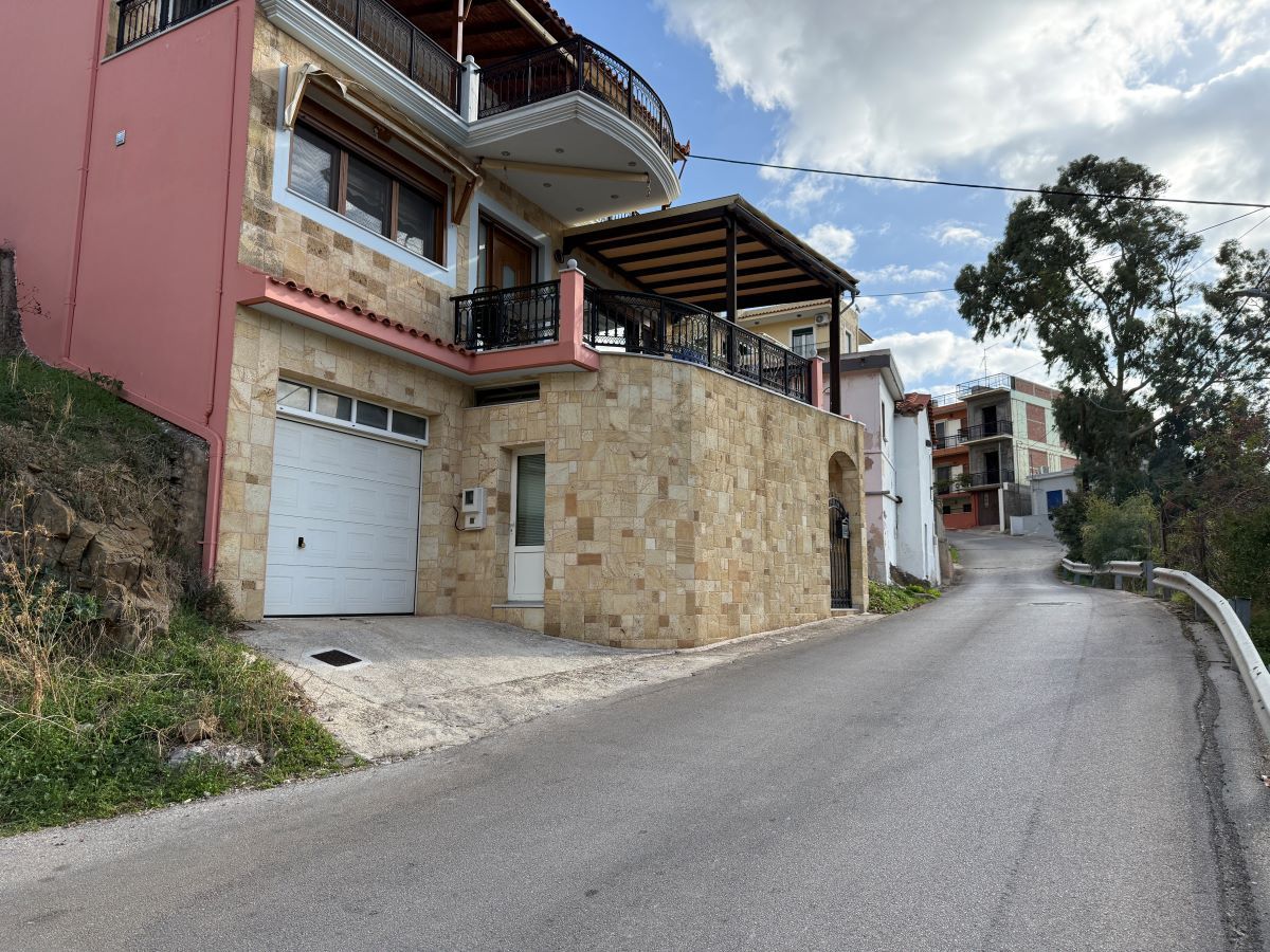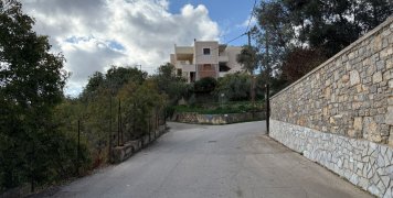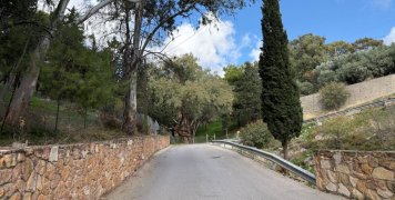 Ο δρόμος εδώ ανηφορίζει, δεξιά ένα γκαράζ με μεταλλικές βοηθητικές ράβδους για άνοδο Ι.Χ. πάνω μια τριώροφη οικία, με μια σύνθεση αμπελιού, ελιάς και πρασινάδας στην είσοδο.