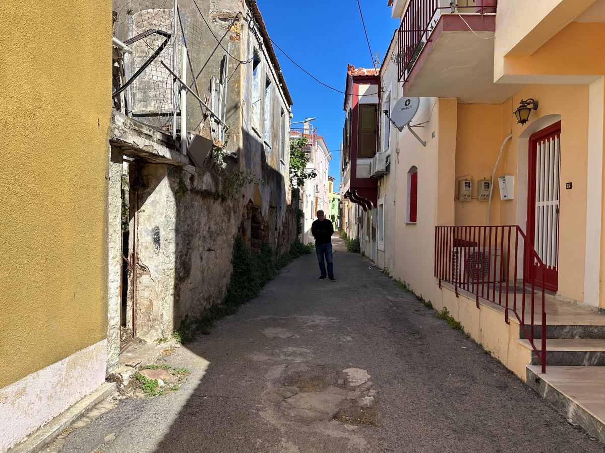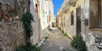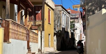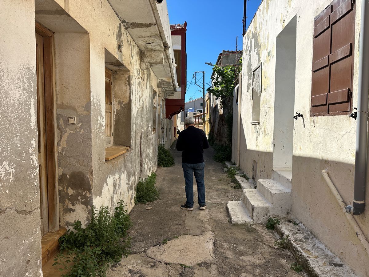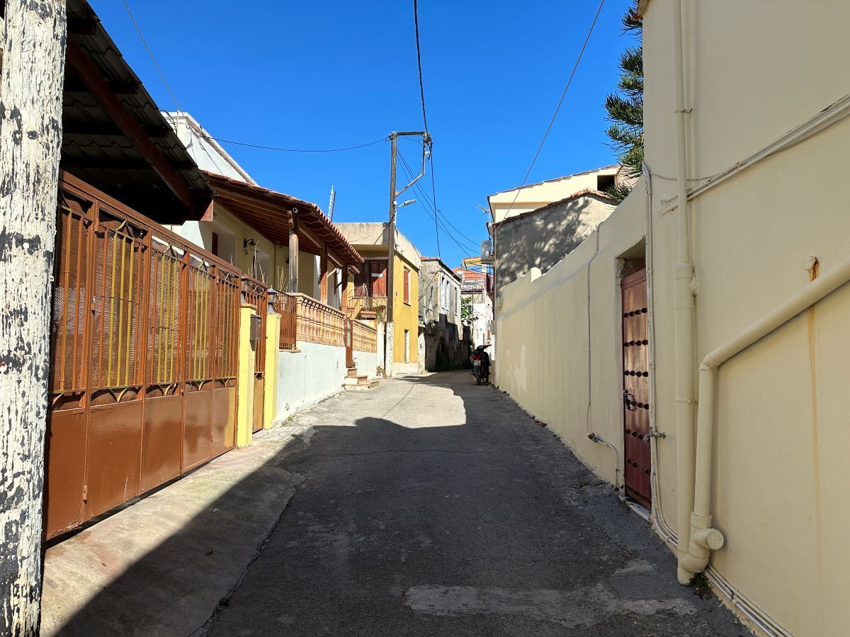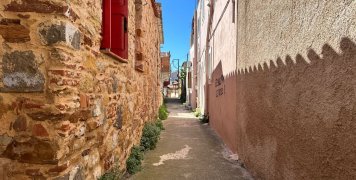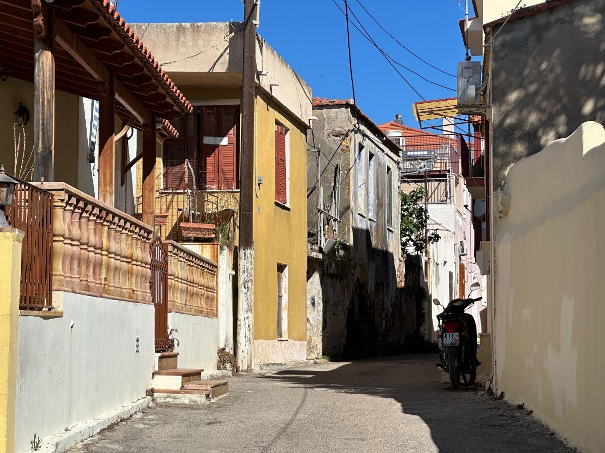 Άχρωμες οικίες στη συνέχεια, μια με χαρακτηριστικά κολωνάκια από Θυμιανούσικη πέτρα, μια άλλη με σκίαστρο στα κάγκελα για να εμποδίζει την θέαση προς τα μέσα, ένα τοιχίο με μια Αροκάρια στο βάθος, μια σιδερένια πόρτα με Μεσαιωνικό διάκοσμο και δυό ψηλά σπίτια, που «πλακώνουν» τον στενό δρόμο.