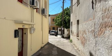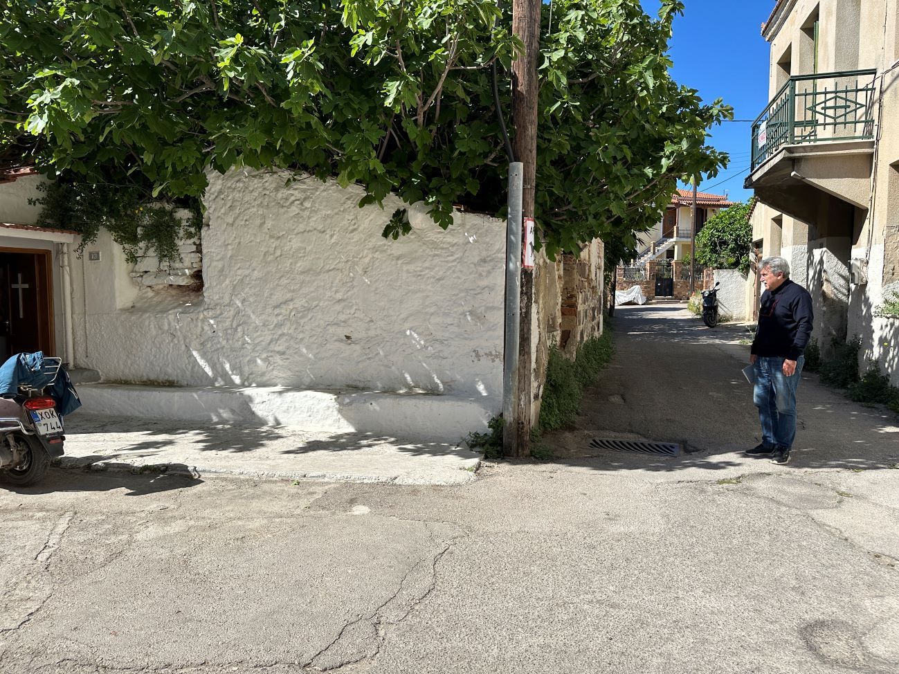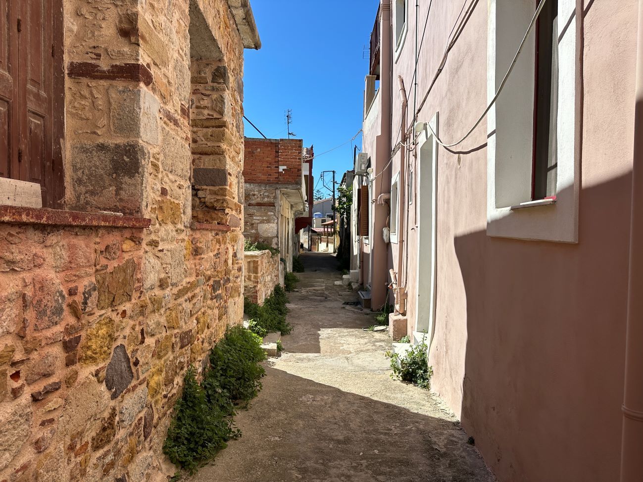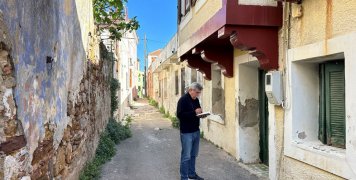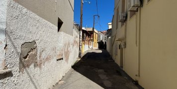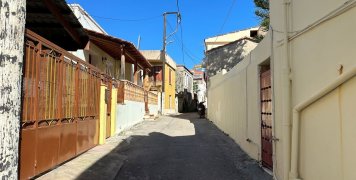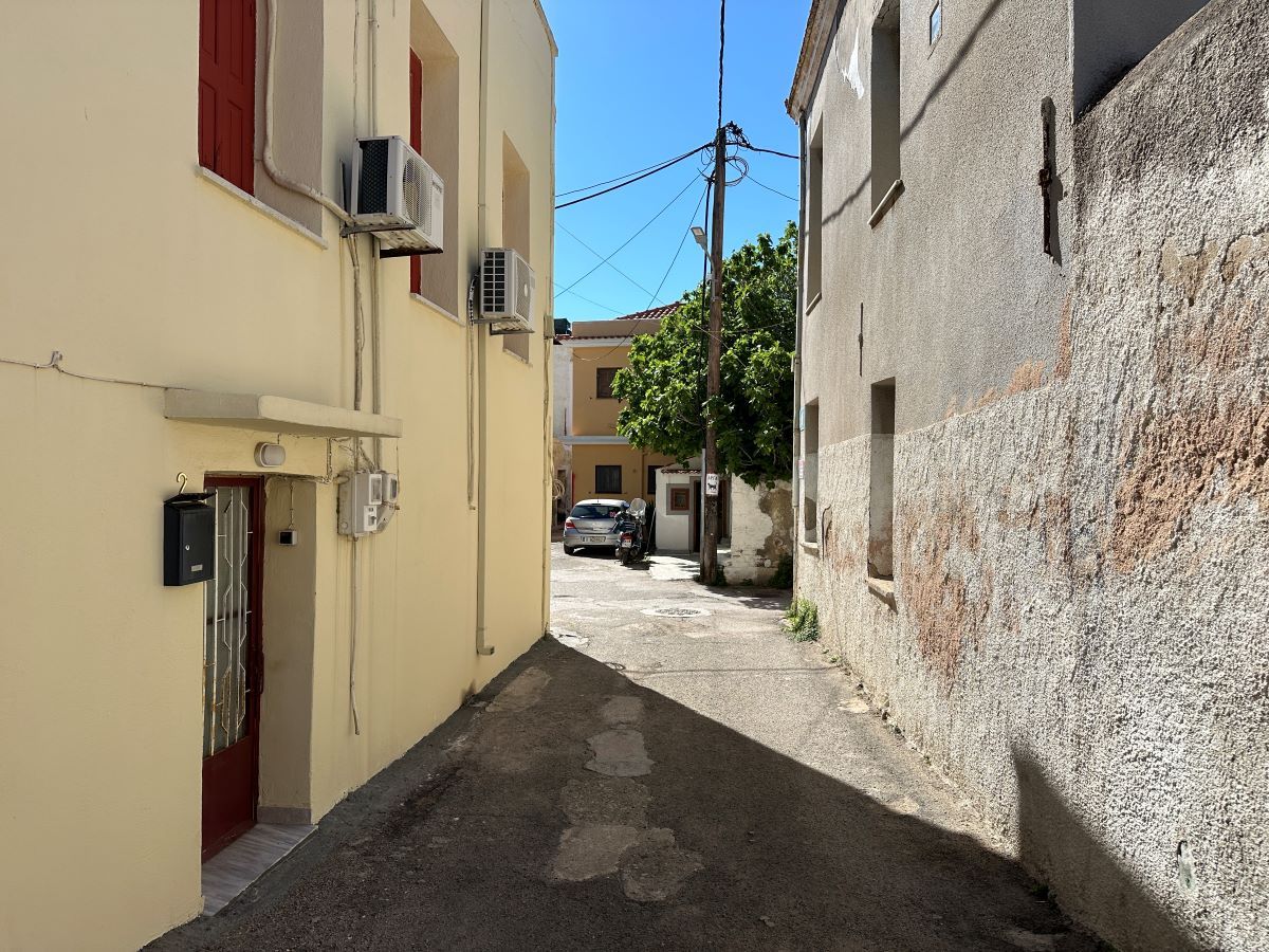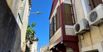 Άχρωμες οικίες στη συνέχεια, μια με χαρακτηριστικά κολωνάκια από Θυμιανούσικη πέτρα, μια άλλη με σκίαστρο στα κάγκελα για να εμποδίζει την θέαση προς τα μέσα, ένα τοιχίο με μια Αροκάρια στο βάθος, μια σιδερένια πόρτα με Μεσαιωνικό διάκοσμο και δυό ψηλά σπίτια, που «πλακώνουν» τον στενό δρόμο.