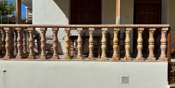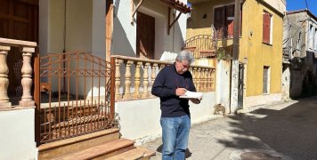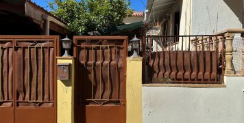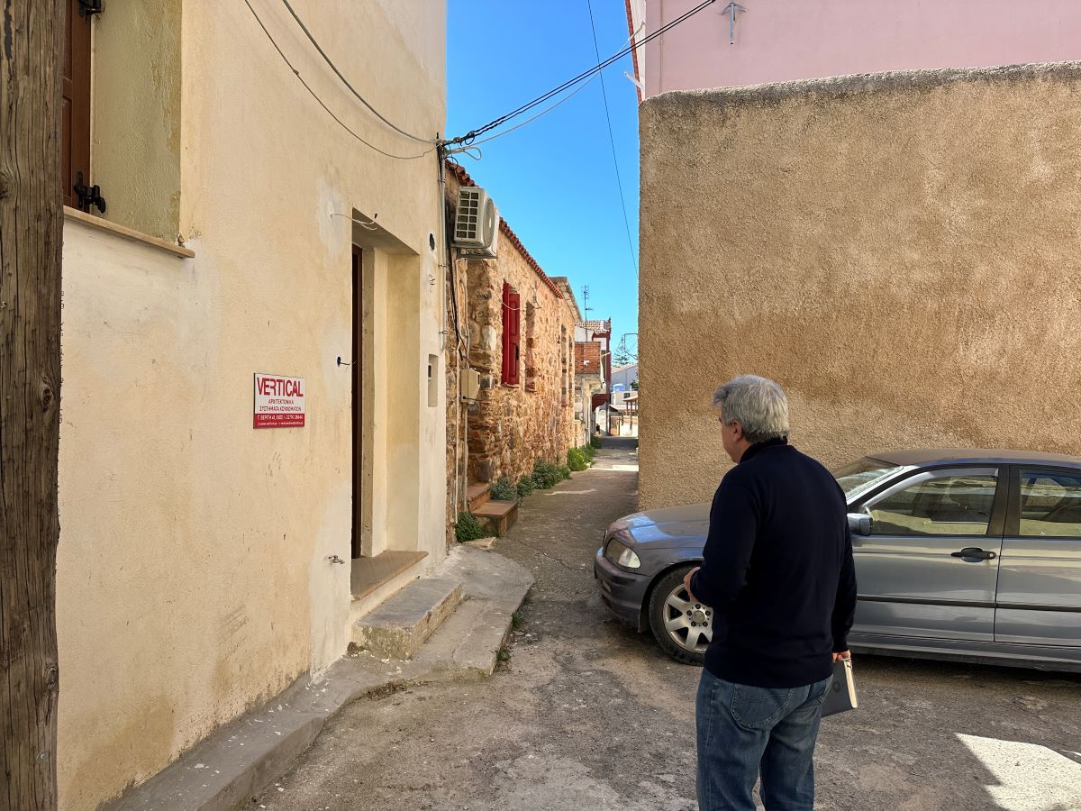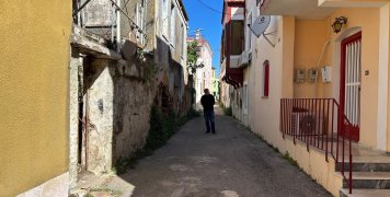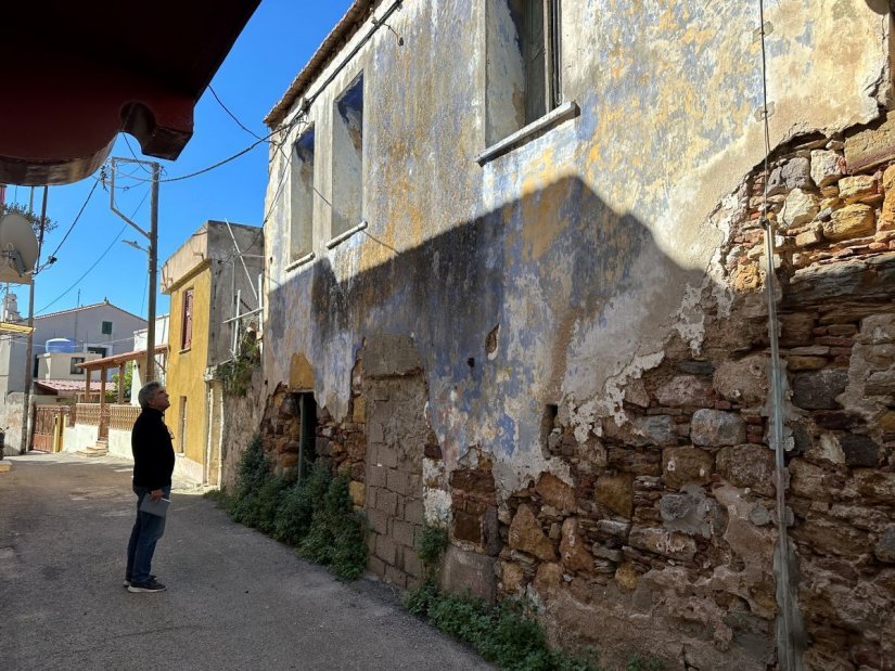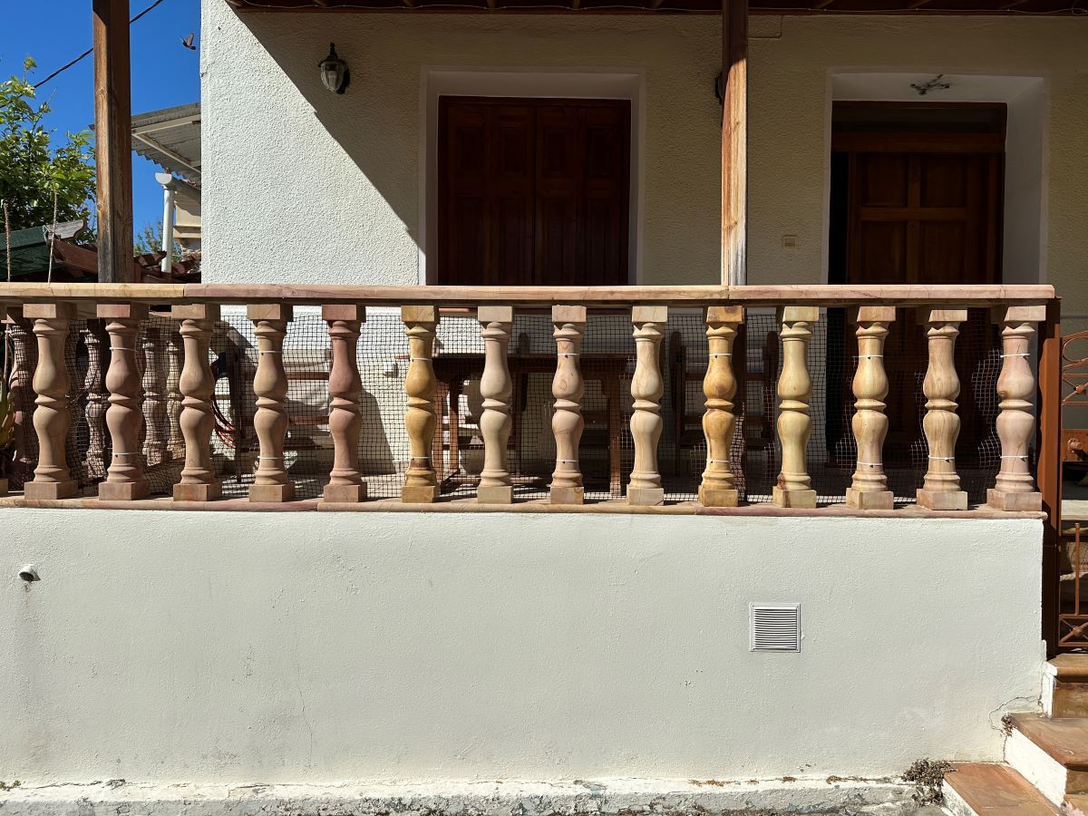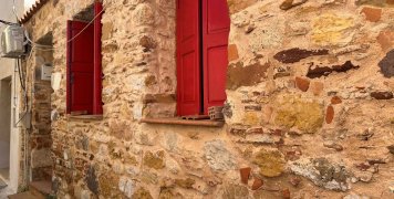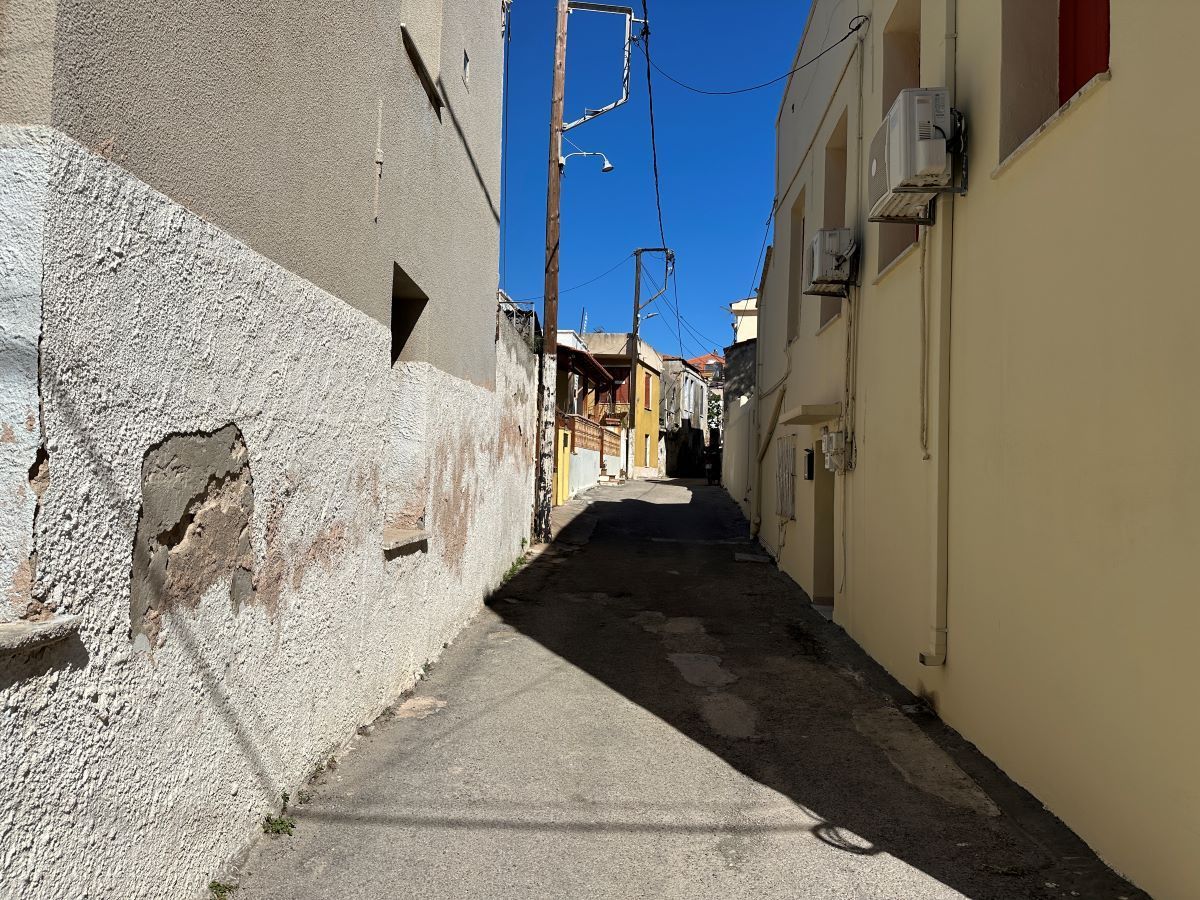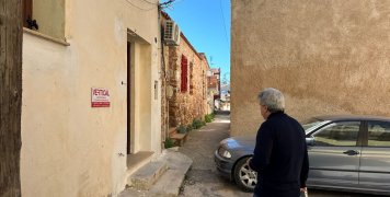 Άχρωμες οικίες στη συνέχεια, μια με χαρακτηριστικά κολωνάκια από Θυμιανούσικη πέτρα, μια άλλη με σκίαστρο στα κάγκελα για να εμποδίζει την θέαση προς τα μέσα, ένα τοιχίο με μια Αροκάρια στο βάθος, μια σιδερένια πόρτα με Μεσαιωνικό διάκοσμο και δυό ψηλά σπίτια, που «πλακώνουν» τον στενό δρόμο.