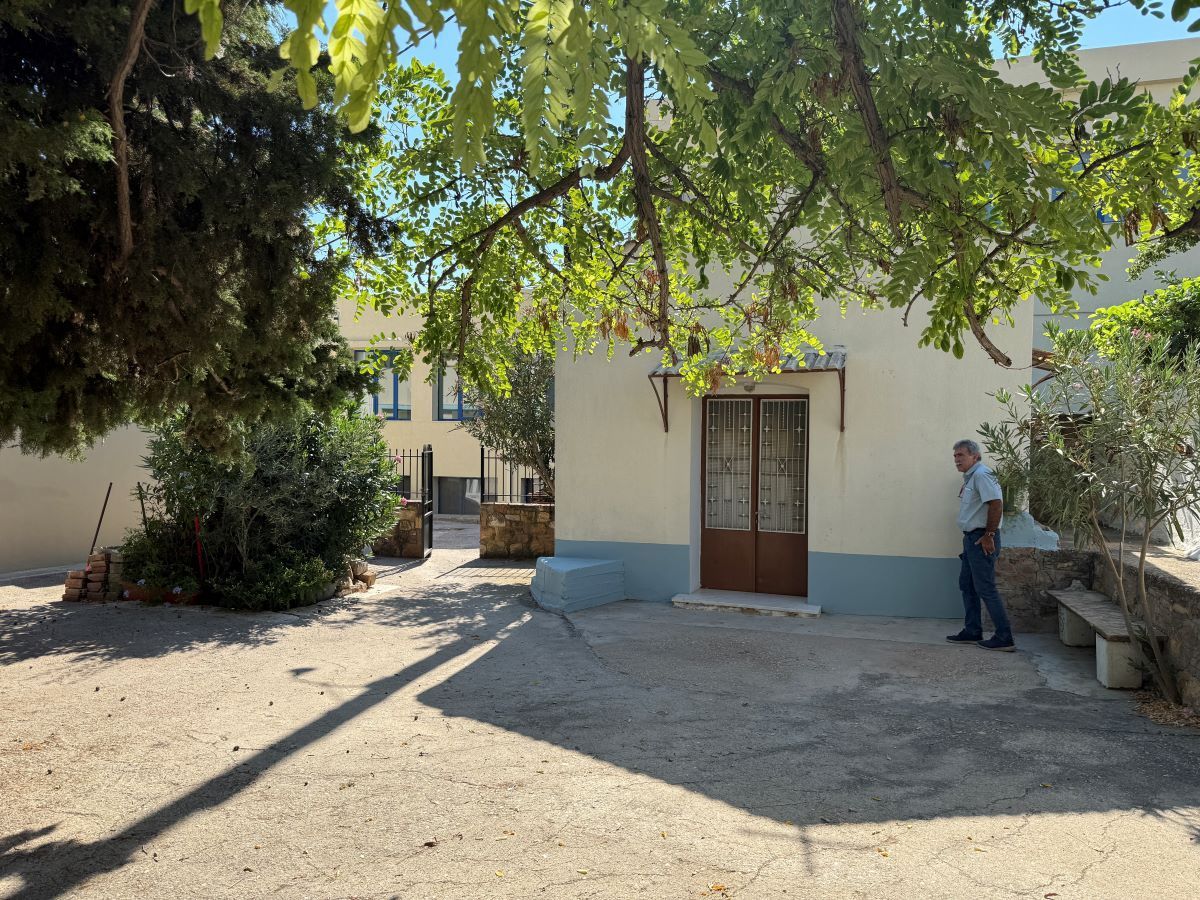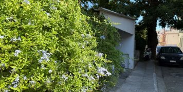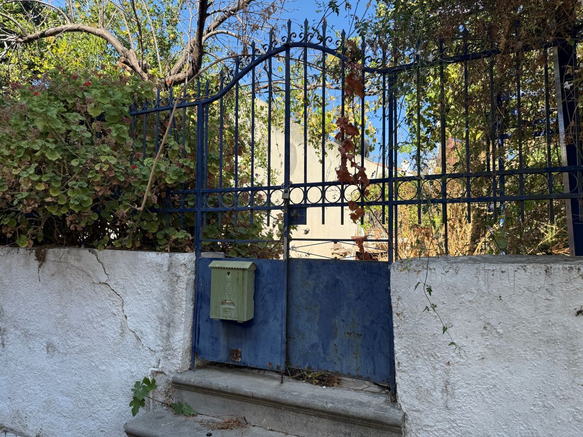 Μια οικία σε άσπρο χρώμα με μπλέ παράθυρα και σκαλοπάτια από μωσαϊκό, αριστερά μας μια πράσινη και άσπρη ξύλινη πόρτα, απέναντι από ένα κήπο με γιασεμιά και ροδιές.