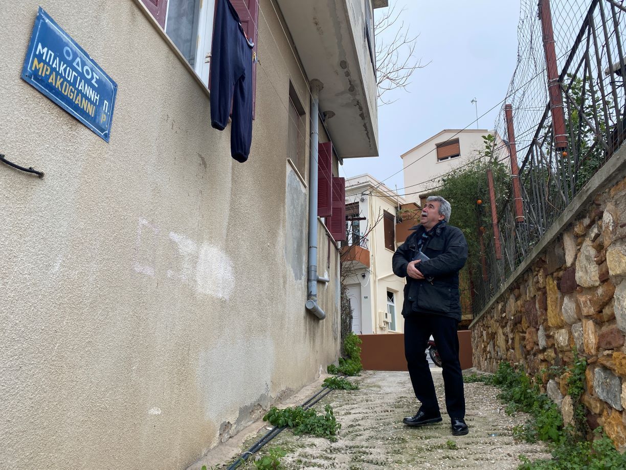 Τότε με «ζεστό» ακόμα το γεγονός ο Δήμος Χίου αφιέρωσε μια οδό στην μνήμη του, πλην όμως… φεύ, οι ανώνυμες οδοί ήταν ανύπαρκτες και έτσι βρέθηκε αυτή η… ταπεινή, που την επισκεφτήκαμε εμείς, έτσι για να της ανεβάσουμε την… διασημότητα.