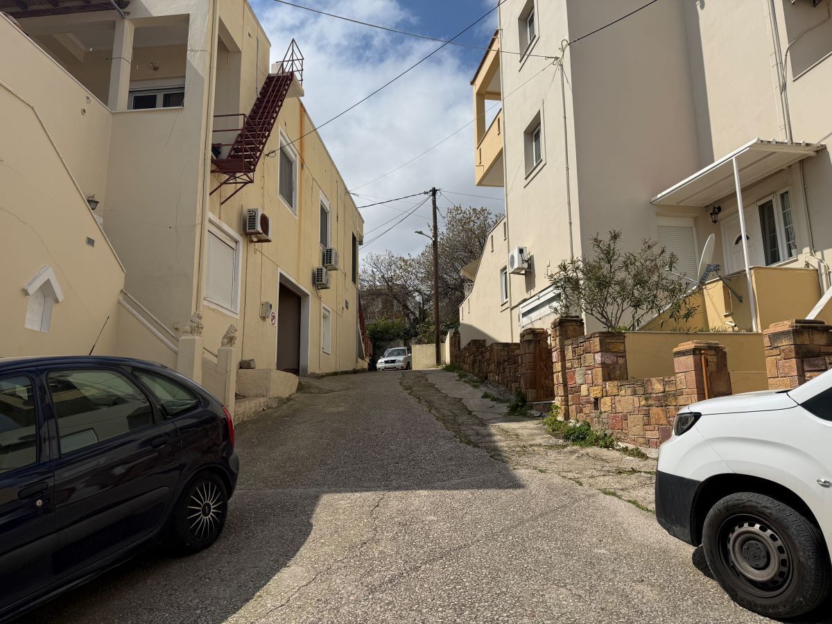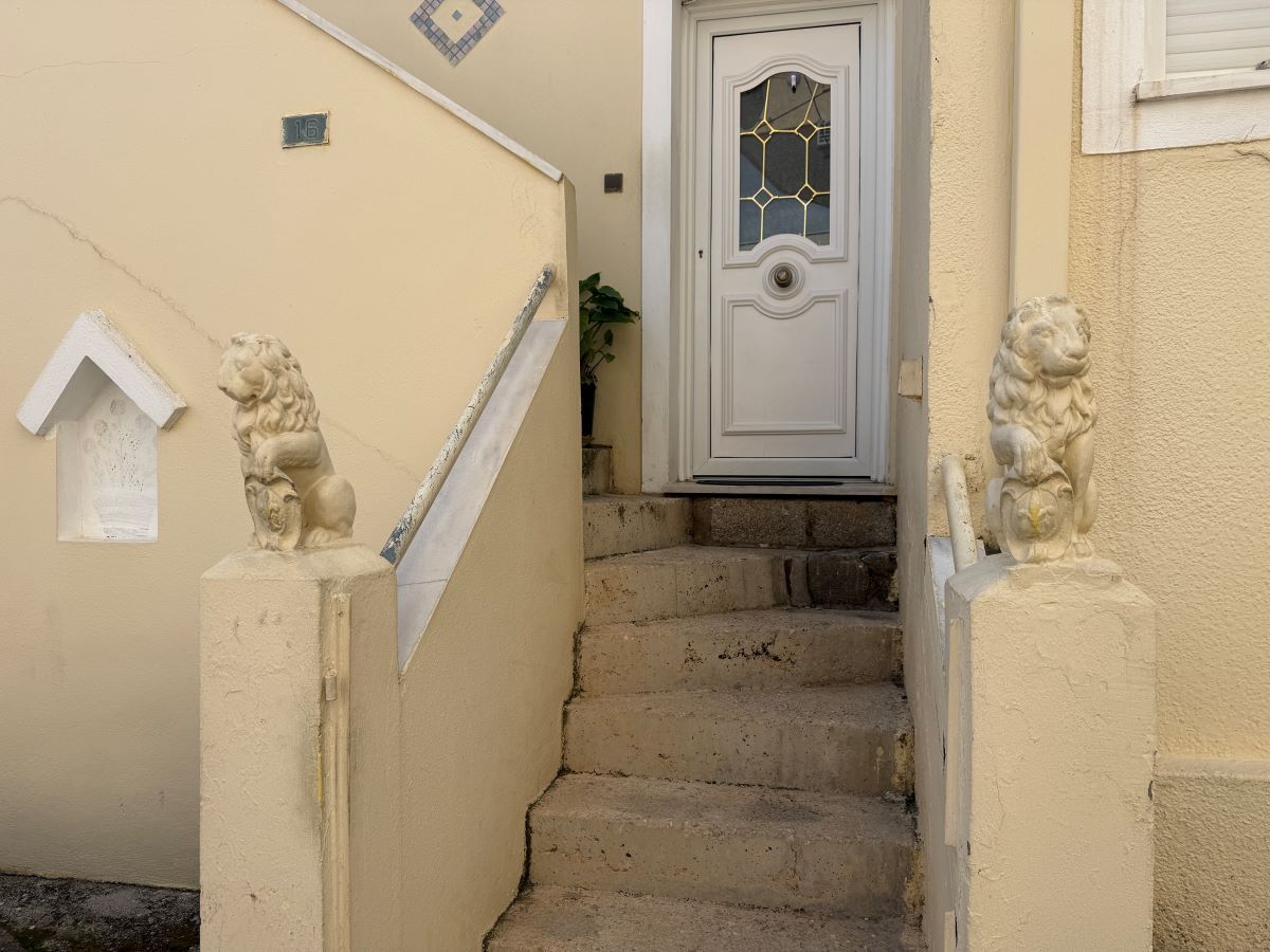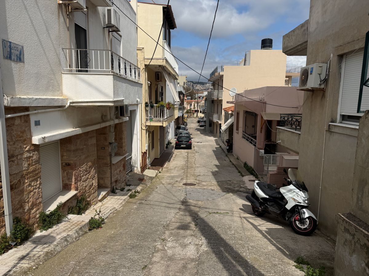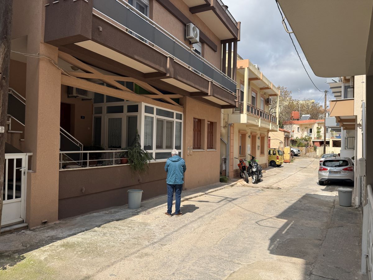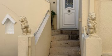 Μια άσπρη σκάλα από αριστερά, με μια αυλή δίπλα, απέναντι από ένα τριώροφο και επίσης απέναντι από άλλη μια οικία με άσπρο κιοσέ.