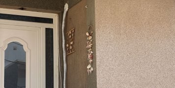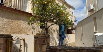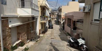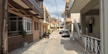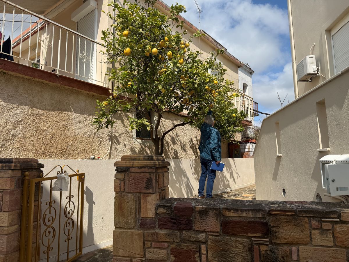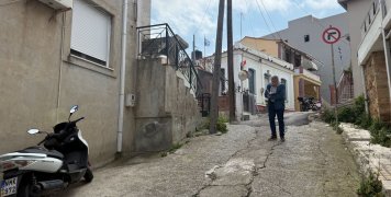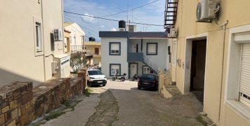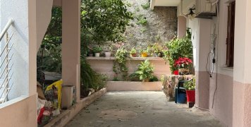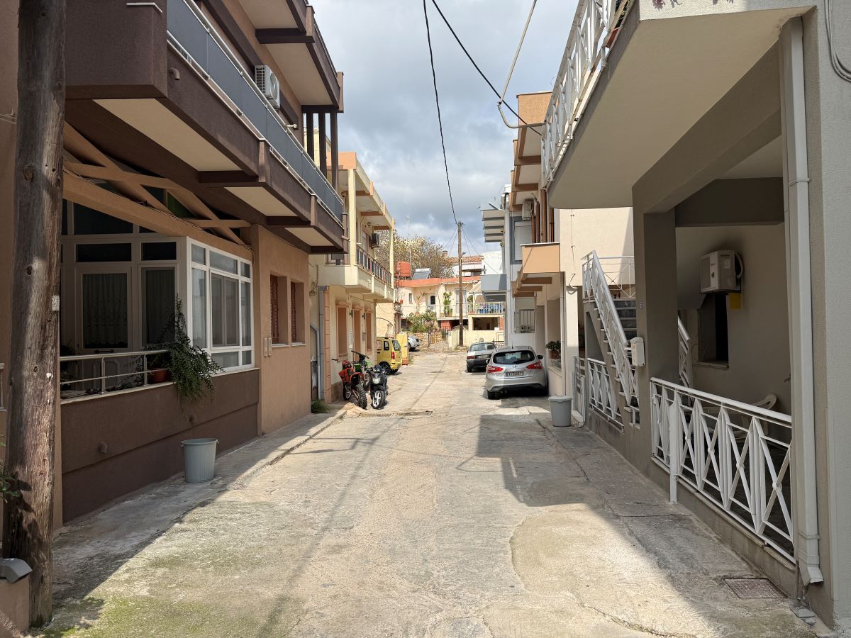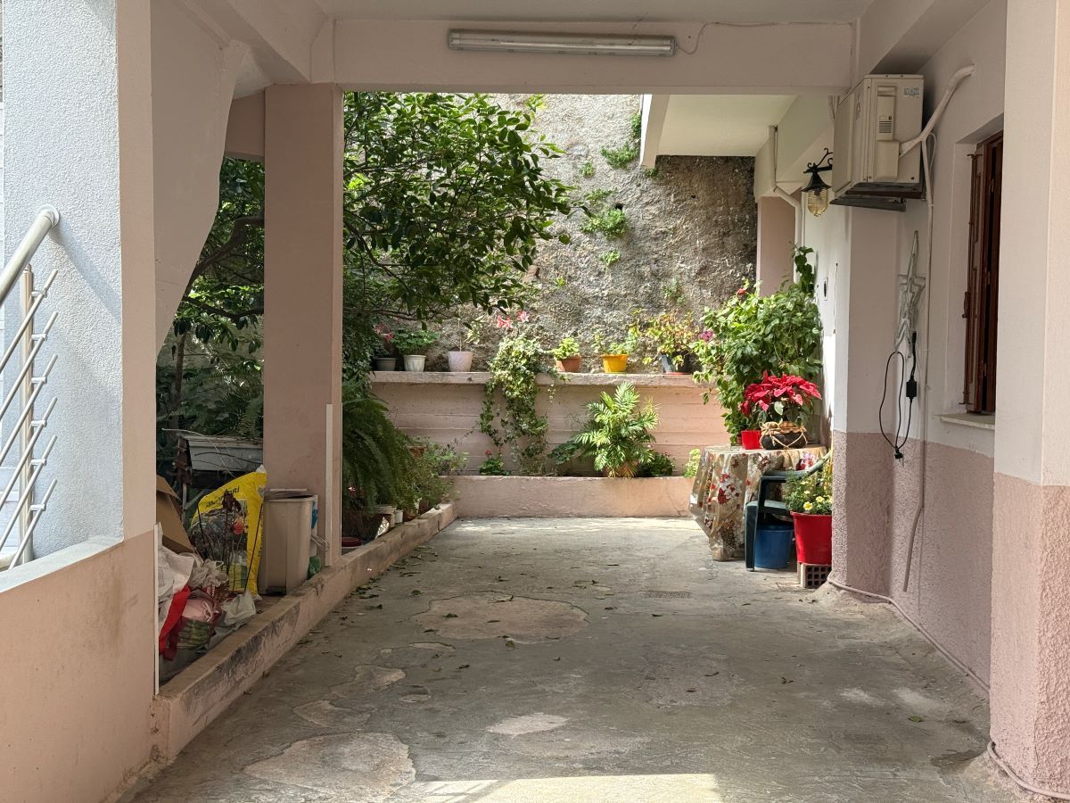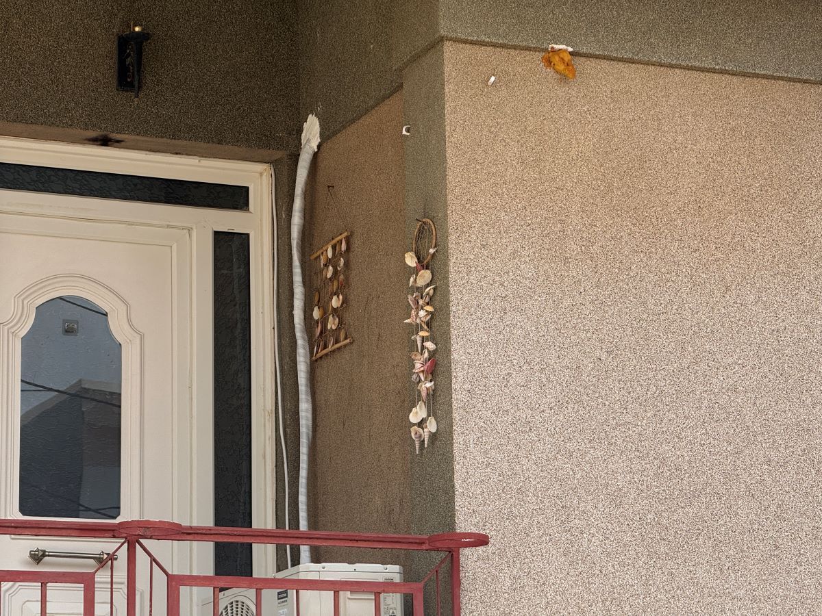 Μια άσπρη σκάλα από αριστερά, με μια αυλή δίπλα, απέναντι από ένα τριώροφο και επίσης απέναντι από άλλη μια οικία με άσπρο κιοσέ.