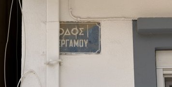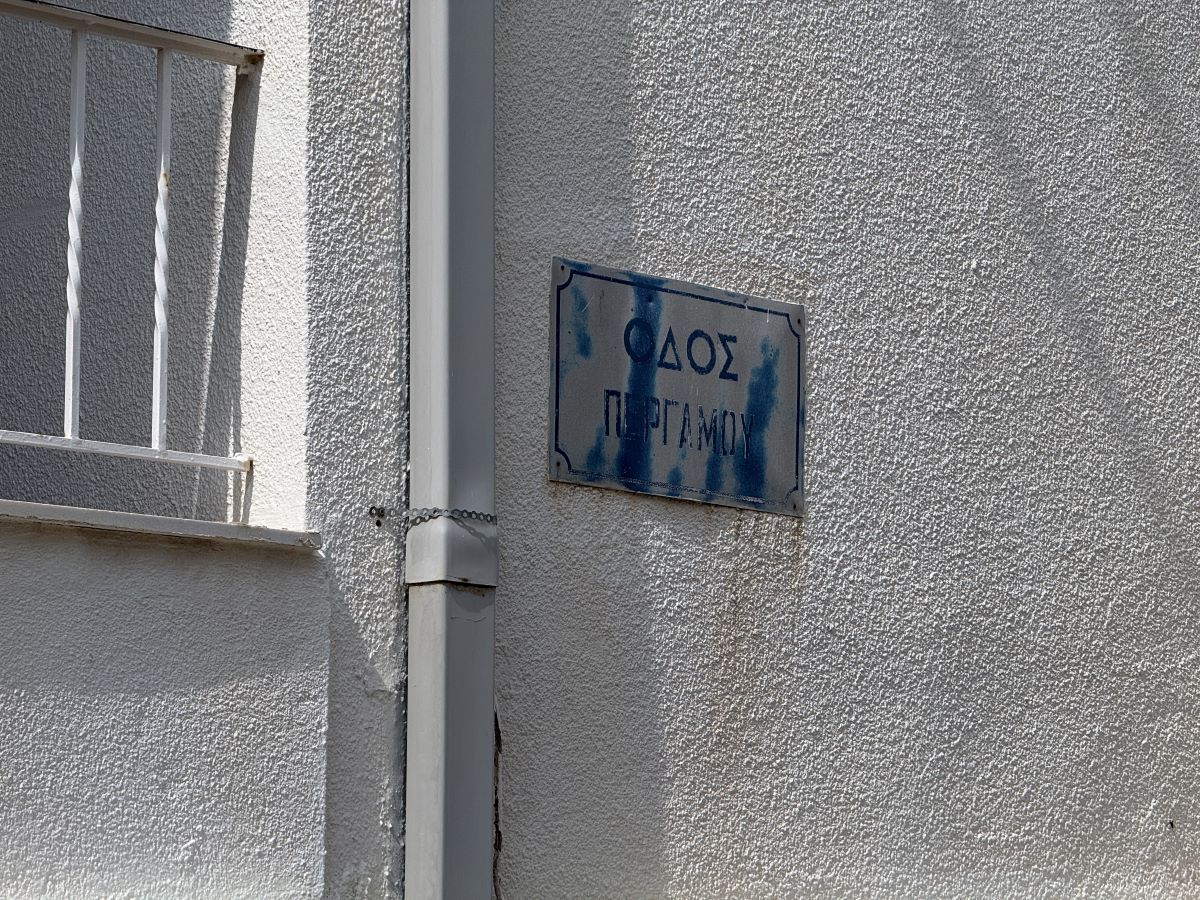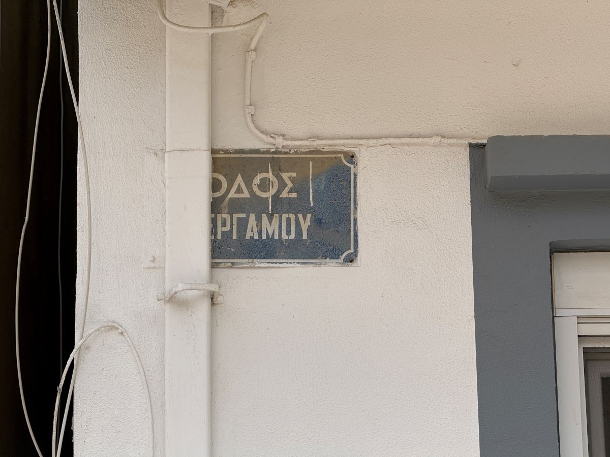 Εδώ η Περγάμου στρίβει δεξιά, σε μια αυλή με μια κατάφορτη λεμονιά, άλλη μια πινακίδα ονοματοθεσίας απέναντι της, δίπλα ένα γκαράζ και μια είσοδος με δύο λιονταράκια.