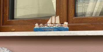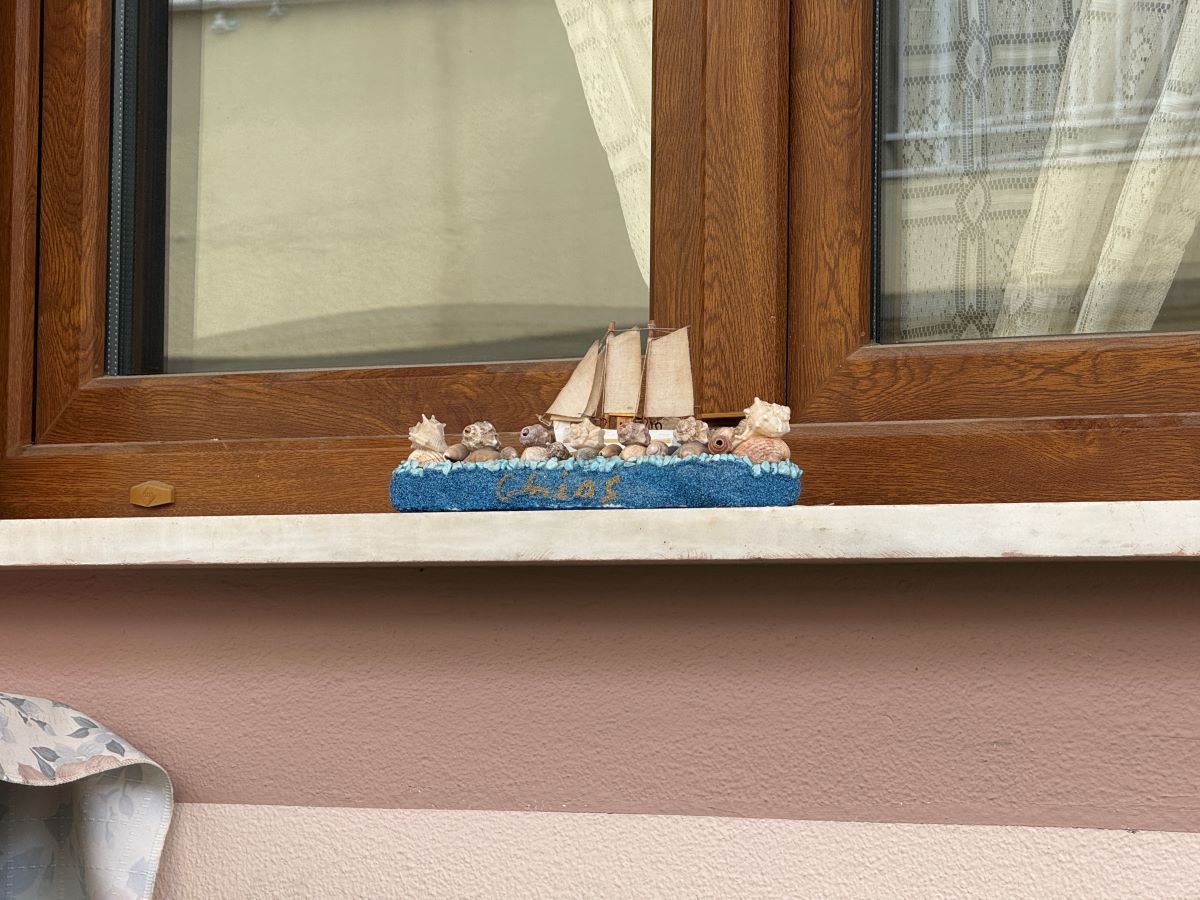 Δεξιά μια οικία στο ροζ χρώμα με μικρά διακοσμητικά καραβάκια στην παραθυρόπλακα, απέναντι από μια άλλη οικία στο καφέ χρώμα με γκαράζ.