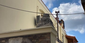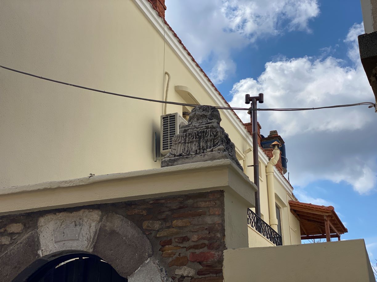 Για να το παρατηρήσει κανείς, πρέπει να αφήσει την είσοδο με την κολώνα που γράφει τα αρχικά Θ.Ν.Ζ. 1953, να παρακάμψει μια… συστάδα από δίκυκλα, να ανεβεί μια σκάλα για να αποκαλυφθούν μπροστά του τρείς αρχαίες κολώνες, που θα μπορούσε κανείς να τις συνδυάσει με τον γειτνιάζοντα χώρο της αρχαίας Εβραϊκής Συναγωγής, που πρόσφατα αποκάλυψε η αρχαιολογική σκαπάνη.