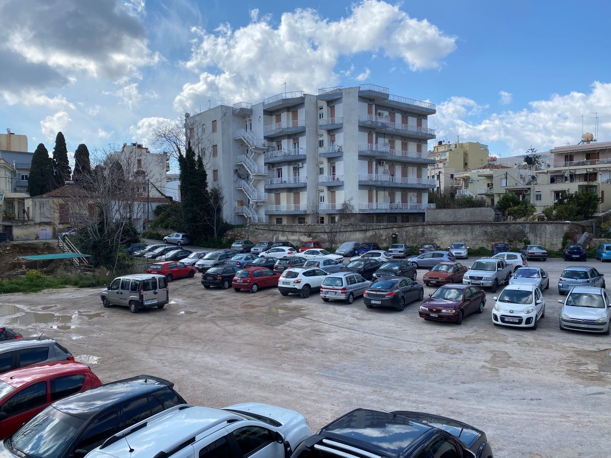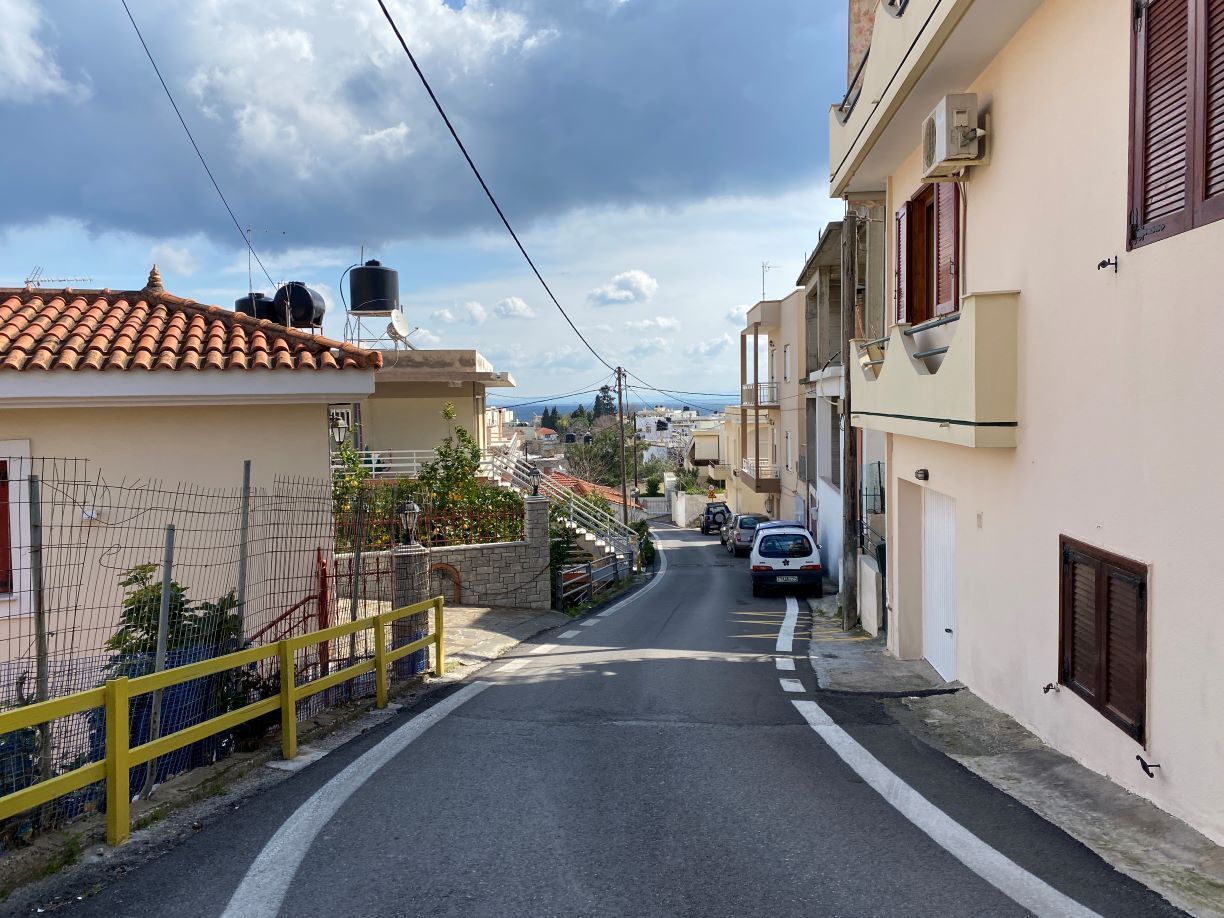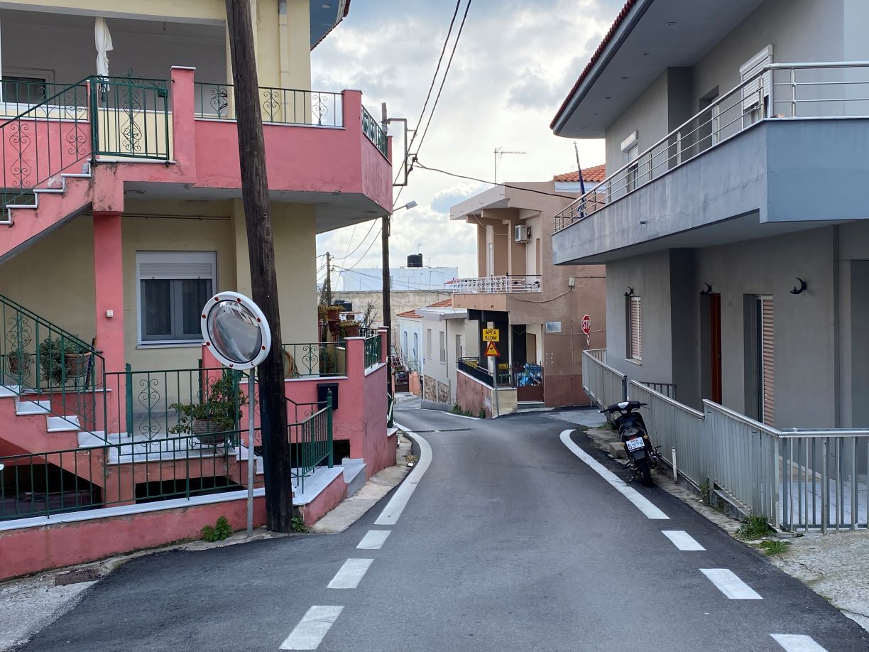 Μια πινακίδα μας δείχνει την πορεία για το κέντρο της πόλης, όπου πράγματι οδηγεί η οδός Σκαραμαγκά, που πριν γίνει δρόμος μέχρι και την δεκαετία του 1960 ήταν χείμαρρος, που κλασικά, όπως κάνουμε και στη Χίο καταπατήθηκε και τα όμβρια νερά επιχειρούνται να εγκλωβιστούν ,όποτε το καταφέρνουμε και δεν πλημμυρίζουμε σε αγωγούς μέσω σχαρών, που υπάρχουν στο οδόστρωμα.