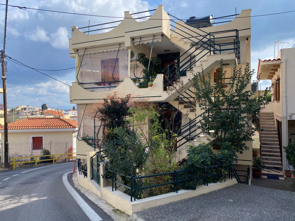 Αντιθέτως εν μέσω οικιών, σημαιών διαφόρων μεγεθών και πινακίδων, που ειδοποιούν ότι στην οδό βαδίζουν μαθητές, ξεχωρίζει η πινακίδα της παρόδου της οδού Περγάμου, ενώ ο δρόμος εδώ γίνεται κατηφορικός, με σπίτια που ευτυχώς φιλοξενούν σε πάρκιγκ τα ΙΧ τους, μέσω μάλιστα μεγάλων πορτών υψηλής αισθητικής.