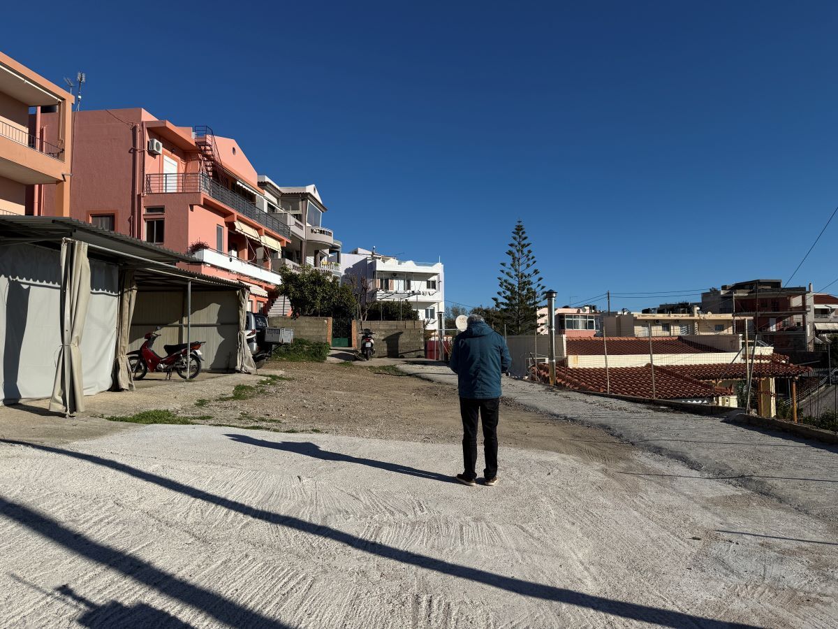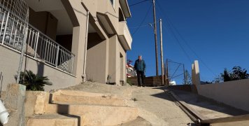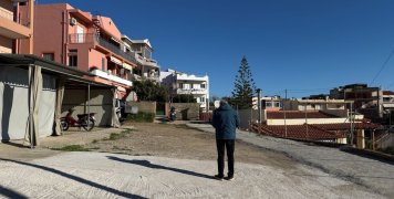 Συνεχίζουμε να κατεβαίνουμε με την πόλη να φαίνεται στο βάθος, μια οικία στο γκρι χρώμα δεξιά και αριστερά μας ένα μεγάλο οικοπεδικό χώρο, από τον οποίο φαίνονται μια Αροκάρια σε τα σπίτια στο βάθος από την μία πλευρά και άλλα αμφιθεατρικά κτισμένα από την άλλη.