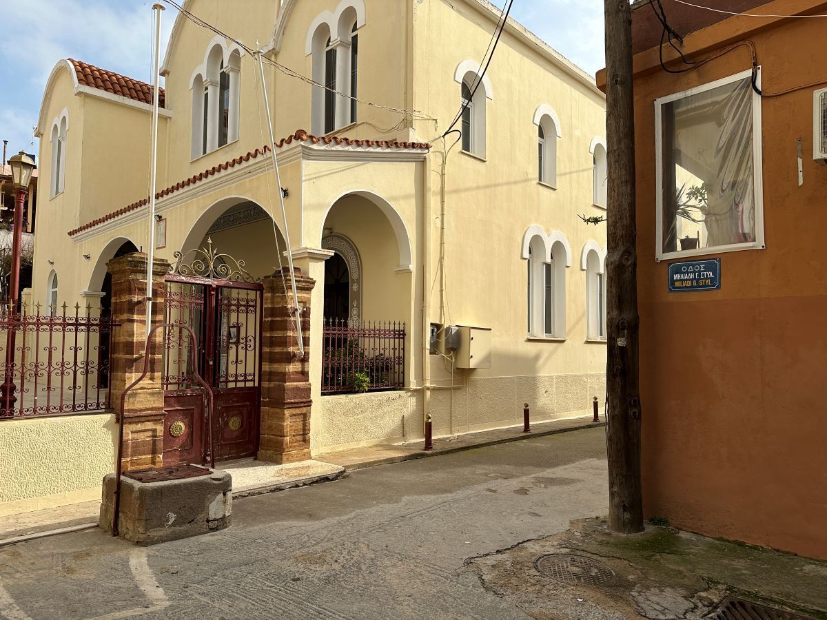 Βγαίνοντας παρατηρούμε το καμπαναριό της, που ανακαινίσθηκε το 1949 και ξαναβγαίνουμε στον δρόμο, που από την μια οδηγεί σε αδιέξοδο και από την άλλη συνεχίζεται, με χαρακτηριστικά μπαλκόνια… καραβίσιες σκάλες και αντιθέσεις μεταξύ ερειπωμένων σπιτιών και άλλων με μαρμάρινες διακοσμήσεις.