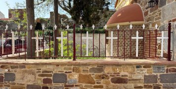 Παρατηρούμε τις καμάρες που σχηματίζονται στους τοίχους του καθώς και την σιδερένια περίφραξη σε σχήμα σταυρού, βγαίνοντας σε μια μικρή πλατεία.