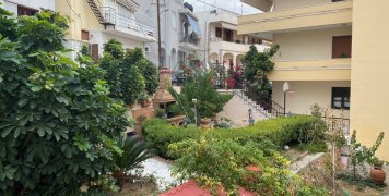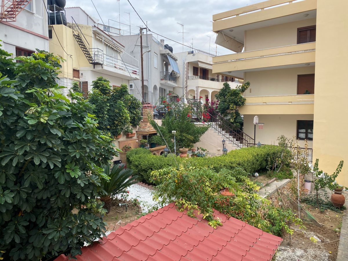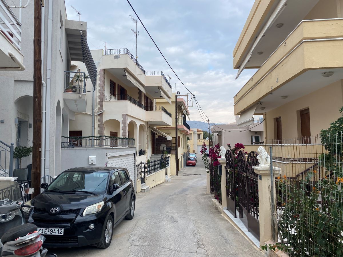 Ένας βοηθητικός καθρέπτης στην έξοδο διευκολύνει την ορατότητα στην οδό, που από την μια πλευρά έχει διώροφα σπίτια με ισόγεια γκαράζ τα περισσότερα και από την άλλη ένα φράκτη, που κρύβει έναν ωραιότατο κήπο.