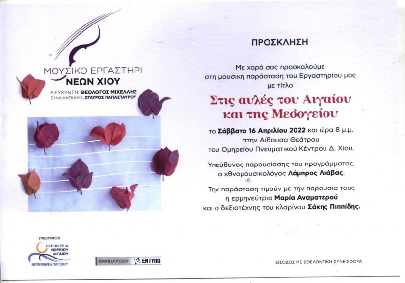 "Στις αυλές του Αιγαίου και της Μεσογείου" είναι ο τίτλος παράστασης του Μουσικού εργαστηρίου Νέων Χίου, που θα δωθεί το Σάββατο 16 Απριλίου στις 8.00 μ.μ. στο Ομήρειο, με την παρουσίαση από τον Εθνομουσικολόγο Λάμπρο Λιάβα.