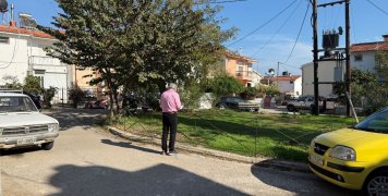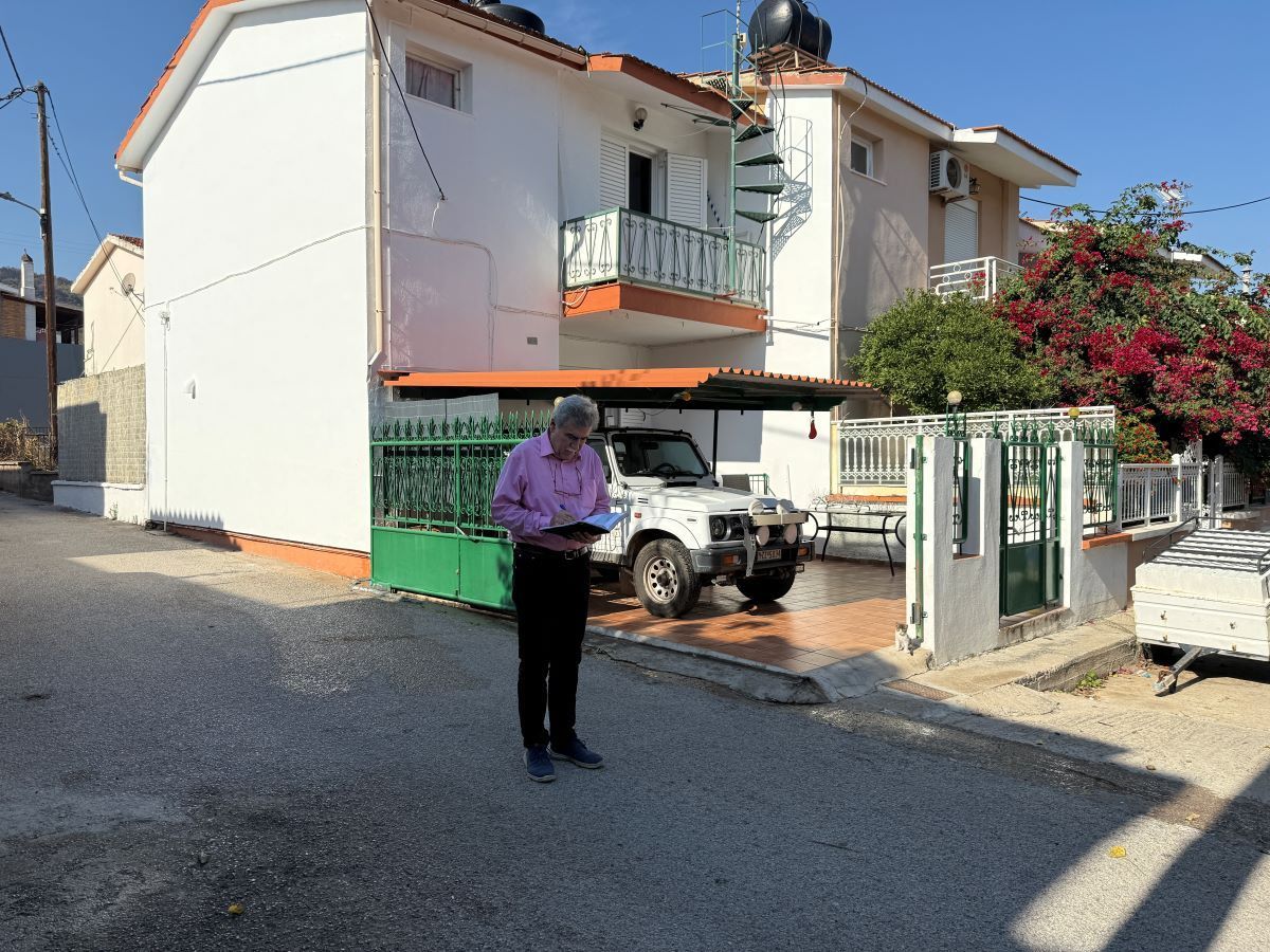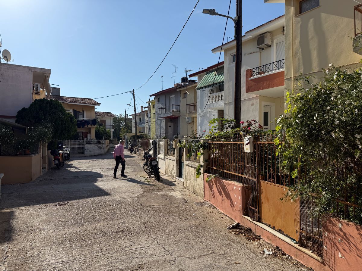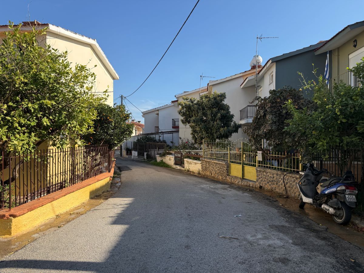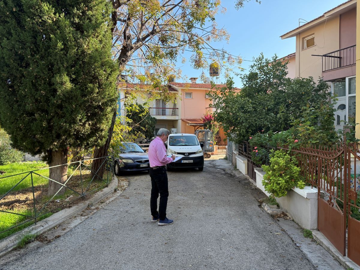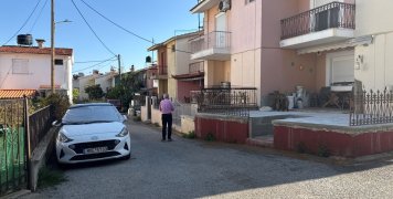 Βγαίνοντας παρατηρούμε την πλούσια πρασινάδα στο απέναντι σπίτι, ένα χώρο στάθμευσης για έξι περίπου Ι.Χ. μια πορτοκαλιά στην αυλή του σπιτιού με τον αριθμό 84, δύο λάμπες με πράσινο και μπλε χρώμα, αυλές με ψησταριές, παγκάκια αλλά και ξυλεία για το τζάκι, άλλες με γλάστρες, θαμνοειδή με θαλασσιές αποχρώσεις ανθέων, ένας χώρος στάθμευσης αριστερά, δεξιά λεμονιές, αμπέλια και μουσμουλιές.