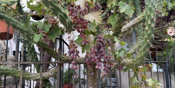Κάγκελα παντού, χωράφια απέναντι και αυλές με πρασινάδα και μια σύνθεση με κακτοειδή και σταφύλια.