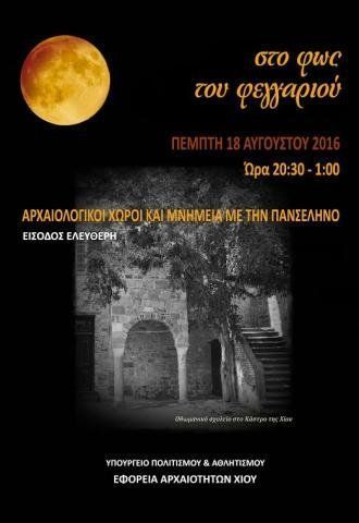 Κάθε χρόνο το Υπουργείο Πολιτισμού και Αθλητισμού γιορτάζει την Αυγουστιάτικη Πανσέληνο με εκδηλώσεις στους αρχαιολογικούς χώρους, στα μνημεία και στα μουσεία σε όλη την Ελλάδα. Η Εφορεία Αρχαιοτήτων Χίου συμμετέχει στον εορτασμό και την Πέμπτη 18 Αυγούστου 2016 θα διατηρήσει ανοιχτούς για το κοινό και επισκέψιμους τους χώρους της:
