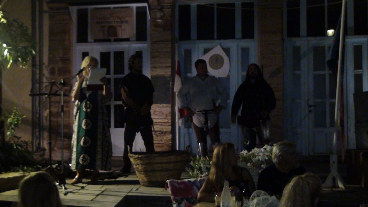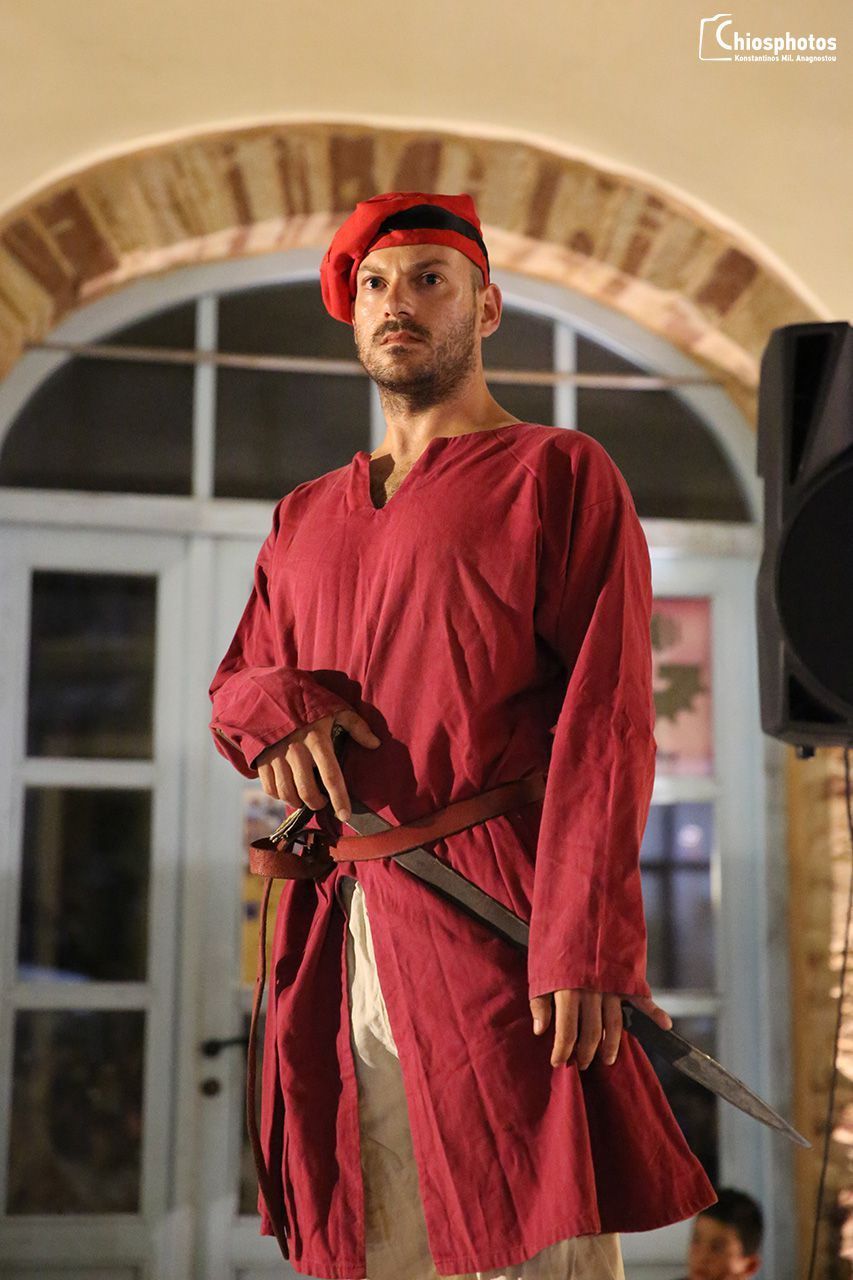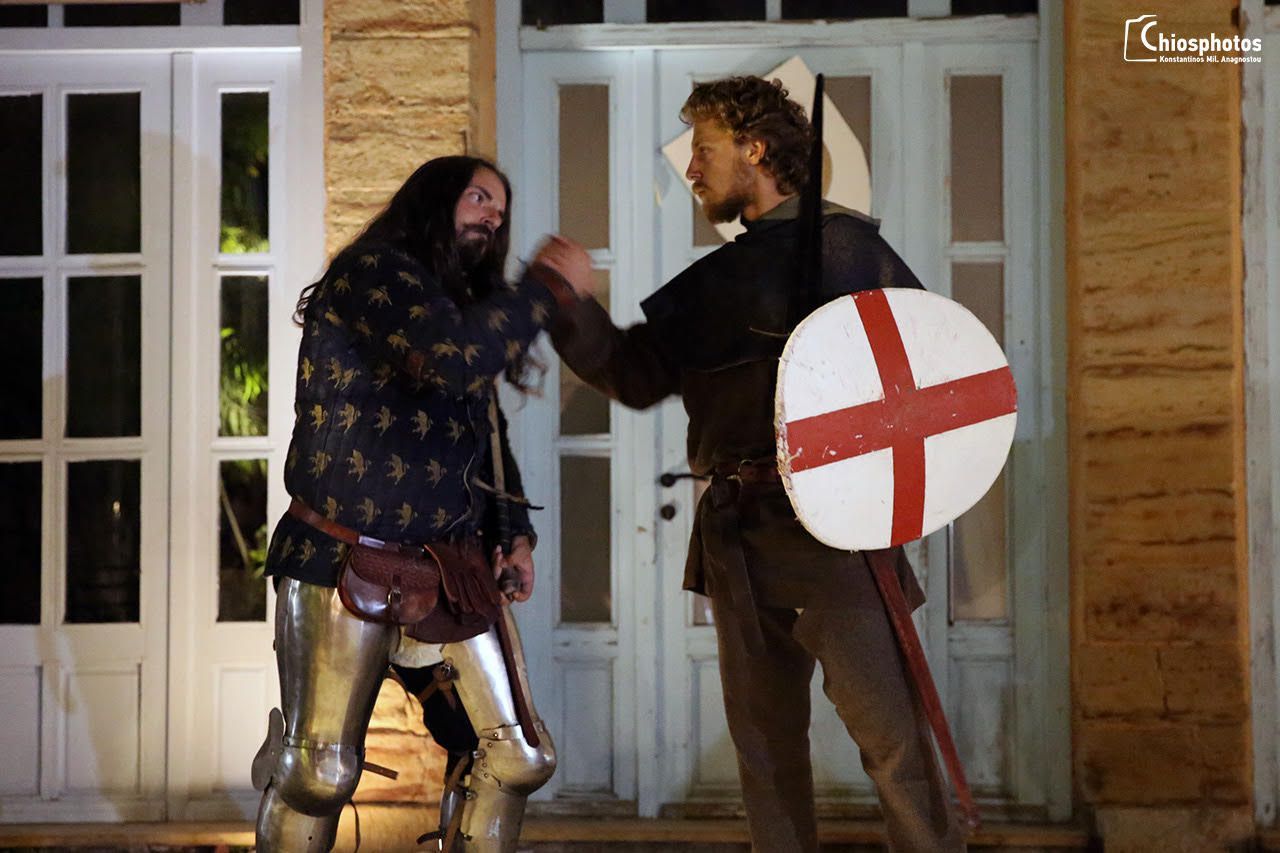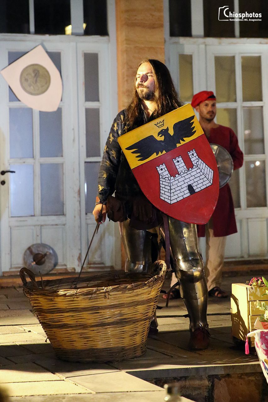 Από νωρίς μοιράστηκαν γλυκά με βάση τη Μαστίχα στο κοινό (που γέμισε την πλατεία του Κάστρου) από τον γενοβέζο ζαχαροπλάστη Michel Paguler και τη χιώτισσα ζαχαροπλάστρια Μαρία Τουμάζου που συνεργάστηκαν. Τα γλυκά αυτά θα διατίθενται από το ''Καφέ του Κάστρου της Χίου'' και από το Κατάστημα ''Μαύρο Πρόβατο'' στη Βολισσό με σκοπό να ενταχθούν στις Διατροφικές συνήθειες της Χίου. Γύρω στις 9 το βράδυ ξεκίνησαν τα δρώμενα με αφήγηση (από την παρουσιάστρια Άννα Κλαδιά), ξιφομαχίες και διαλόγους από τους χιώτες και ιταλούς ηθοποιούς με τις μεσαιωνικές φορεσιές τους, τα ακόντια, τα ξίφη και τα λάβαρα των Ιπποτών (γύρω από τα τραπέζια και την πλατεία και μπροστά στο παλαιό Ξενοδοχείο του Κάστρου) και με τη μουσική συνοδεία ενδιάμεσα στα θέματα από τους υιούς του Μαρκέλλου Πούπαλου (με λαούτο και βιολί) και τη Μαρία Πουπάλου με τον γιο της τον Αποστόλη, που τραγούδησαν παραδοσιακά κομμάτια της Χίου όπως η ''Πετροπέρδικα''.