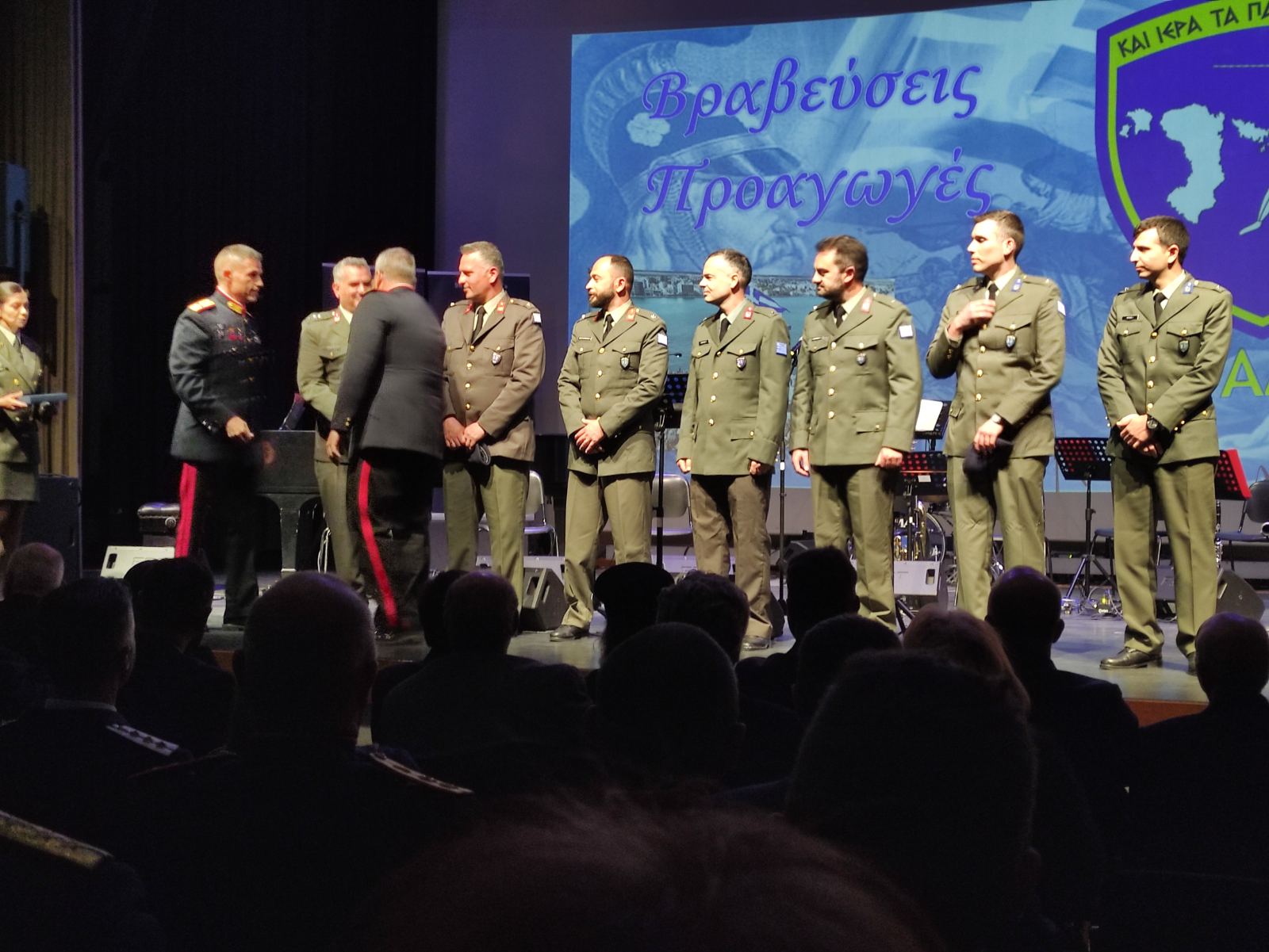 Η εκδήλωση, που διακρίθηκε για την αρτιότητα και την λιτότητα της, ξεκίνησε αρχικά με την απονομή προαγωγών Εφέδρων Αξιωματικών του νησιού μας από τον Διοικητή και υποδιοικητή της Ταξιαρχίας καθώς και με βράβευση του συμπατιώτη μας Στέφανου Κολόμβου που εισήχθη 2ος στην Σχολή Ευελπίδων (τη απουσία του το βραβείο παρέλαβε ο πατέρας του) και συνεχίστηκε με επίκαιρο μουσικό πρόγραμμα με την ορχήστρα της 96 ΑΔΤΕ, πλαισιωμένη από τους Χιώτες τραγουδιστές Δημήτρη Λιούντρη και Αθηνά Βελισσάρη, ενώ με μεγάλη επιτυχία απέδωσε τραγούδια και η ΕΠΟΠ στρατιώτης Ελένη – Αναστασία Ματθαίου.