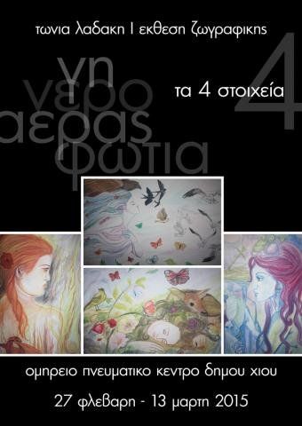 Στις 27 Φλεβάρη εγκαινιάζεται στο Ομήρειο Πνευματικό Κέντρο Δήμου Χίου η 9η Ατομική Έκθεση Ζωγραφικής της Τώνιας Λαδάκη. Η ζωγράφος εμπνεόμενη από τα 4 φυσικά στοιχεία (Φωτιά, γη, νερό, αέρας) εκθέτει συνολικά 33 έργα ζωγραφικής ποικίλων υλικών και τεχνικών.