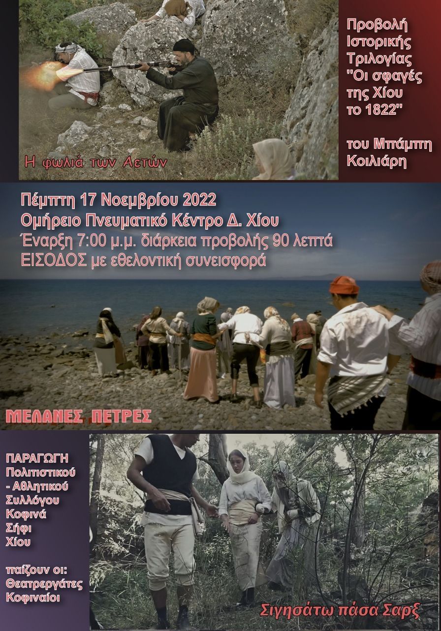 Η κινηματογραφική τριλογία του Μπάμπη Κοιλιάρη για τις σφαγές της Χίου προβάλλεται στο Ομήρειο Πν. Κέντρο Δ. Χίου την Πέμπτη 17 Νοεμβρίου 2022, στις 7 μ.μ.