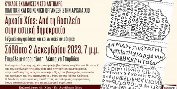 Ο κοινωνικός χώρος Αντίβαρο, στην οδό Καλοπλύτου 44, εγκαινιάζει κύκλο εκδηλώσεων με τίτλο «Βραδιές Τοπικής Ιστορίας» από αυτό το Σάββατο 2 Δεκεμβρίου, στις 7 το απόγευμα. Στην πρώτη εκδήλωση της σειράς η αρχαιολόγος Δέσποινα Τσαρδάκα αναδεικνύει όψεις της πολιτικής και κοινωνικής οργάνωσης στην αρχαία Χίο, με έμφαση στο πέρασμα από τη βασιλεία στην αστική δημοκρατία, τις ταξικές συγκρούσεις και τις κοινωνικές ανισότητες.