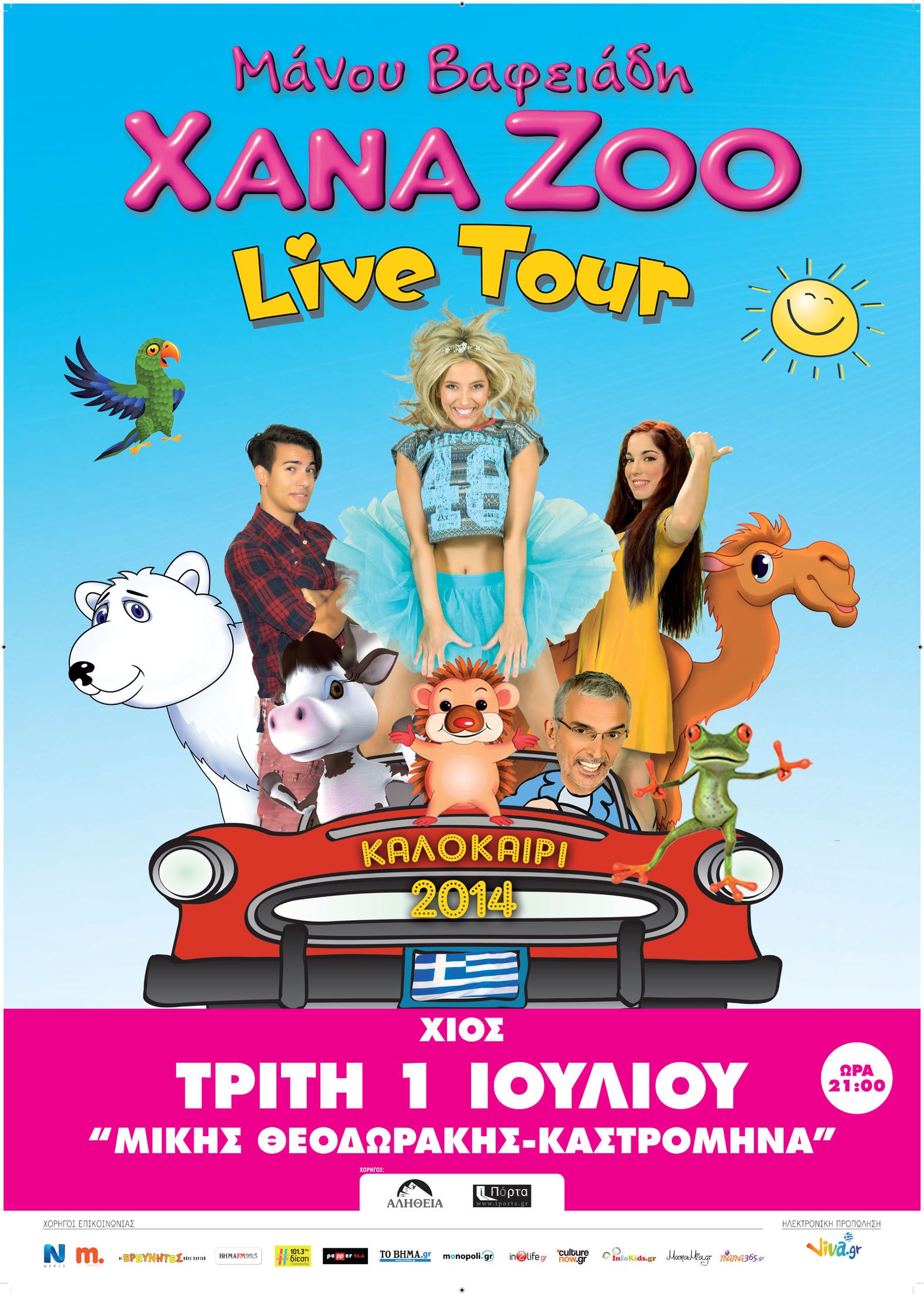 «ΧΑΝΑ ΖΟΟ»: Ένα θεότρελο Μουσικοχορευτικό Show! Οι αγαπημένοι μας ήρωες: η Τερέζα, η Μάρδη και ο Άρης, παρέα με τον Φαταούλα, τον Αστακό, την Αγελάδα, τον Βάτραχο και όλους τους ήρωες της Χοραλίας αυτό το καλοκαίρι κοντά μας.