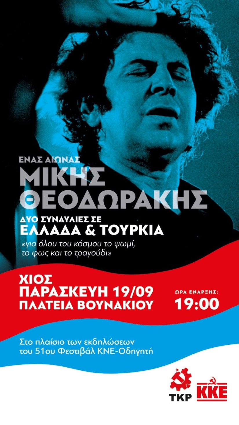 Η ΚΕ του ΚΚΕ και η Κεντρική Επιτροπή του Κομμουνιστικού Κόμματος Τουρκίας (TKP) τιμούν τον έναν αιώνα από τη γέννηση του Μίκη Θεοδωράκη με δύο ξεχωριστές συναυλίες στη Χίο, τόπο γέννησης του συνθέτη και στη Σμύρνη, με τίτλο: «Για όλου του κόσμου το ψωμί, το φως και το τραγούδι».