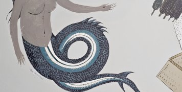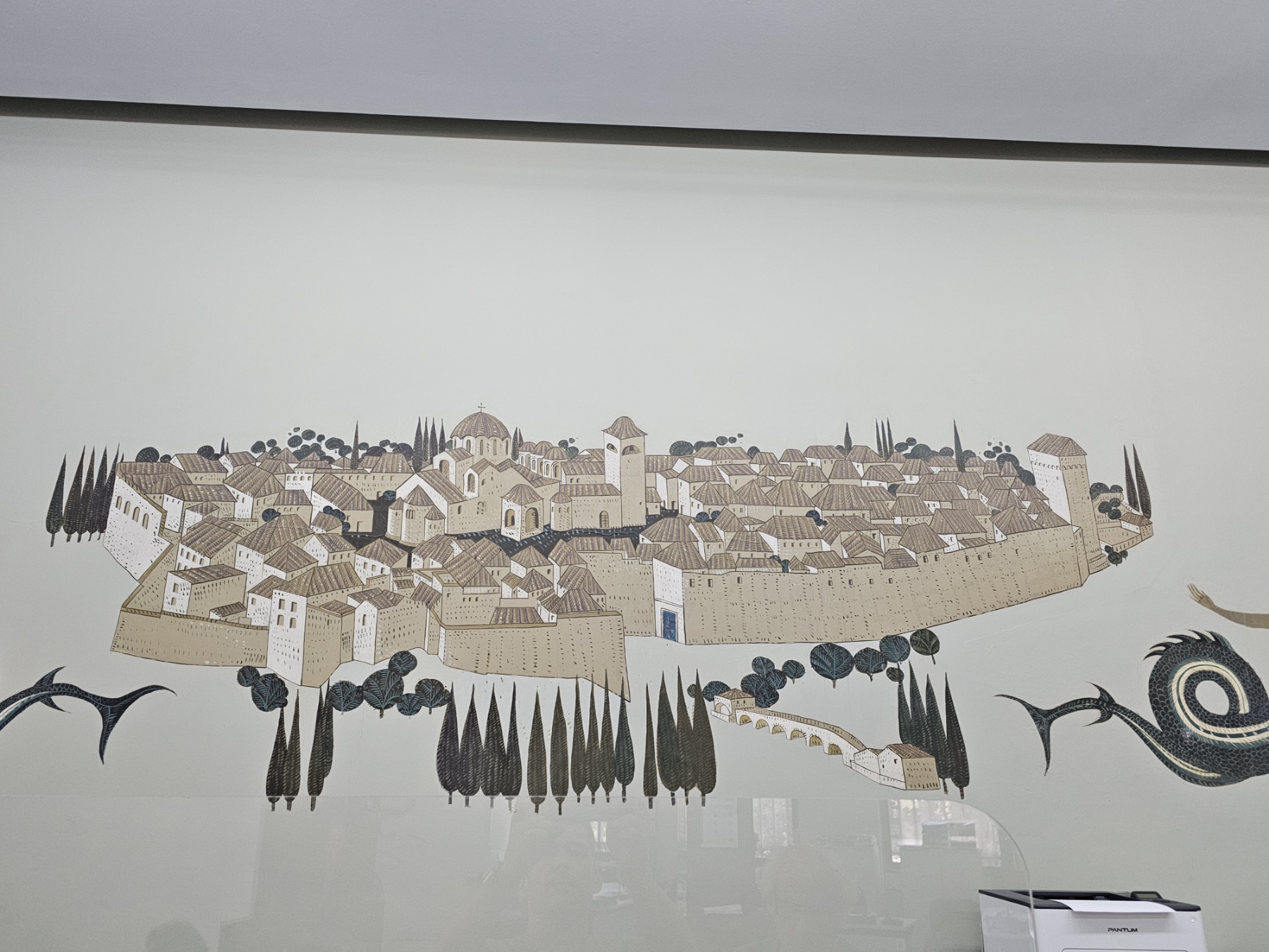 Θαυμάστε τα ιστιοφόρα, τα κοχύλια, τα δελφίνια, τις κομψές γοργόνες που σιμά τους βρίσκεται αντιφατικά η καστροειδής Ν.Μονή, βγαλμένη από σχέδιο του Ρώσου μοναχού Βασίλειου Μπάρσκυ.