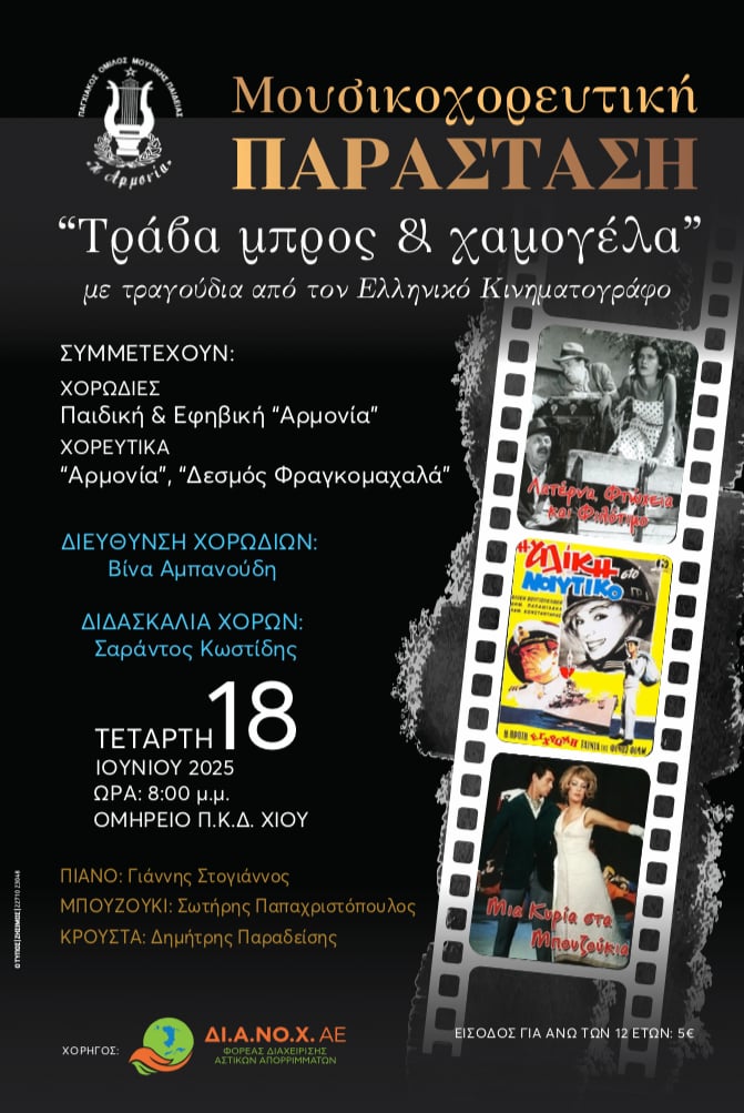 Μουσικοχορευτική παράσταση με τραγούδια από τον Ελληνικό Κινηματογράφο και με τίτλο «Τράβα μπρος και χαμογέλα» θα πραγματοποιηθεί από τις Παιδική και Εφηβική Χορωδίες της «Αρμονίας» και τα χορευτικά τμήματα της «Αρμονίας» και του «Δεσμού Φραγκομαχαλά», την Τετάρτη 18 Ιουνίου, στις 8 μ.μ. στο Ομήρειο.