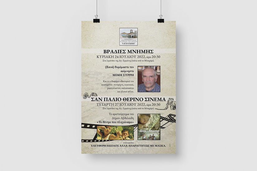 Με στόχο να «ζωντανέψει» το λιμανάκι της Αγίας Ερμιόνης από αύριο Κυριακή και κάθε Κυριακή, υπό την αιγίδα του συλλόγου Αγία Ερμιόνη, επανέρχονται οι «Βραδιές μνήμης» και κάθε Τετάρτη η προβολή ποιοτικών ελληνικών ταινιών στις 8:30 το βράδυ.