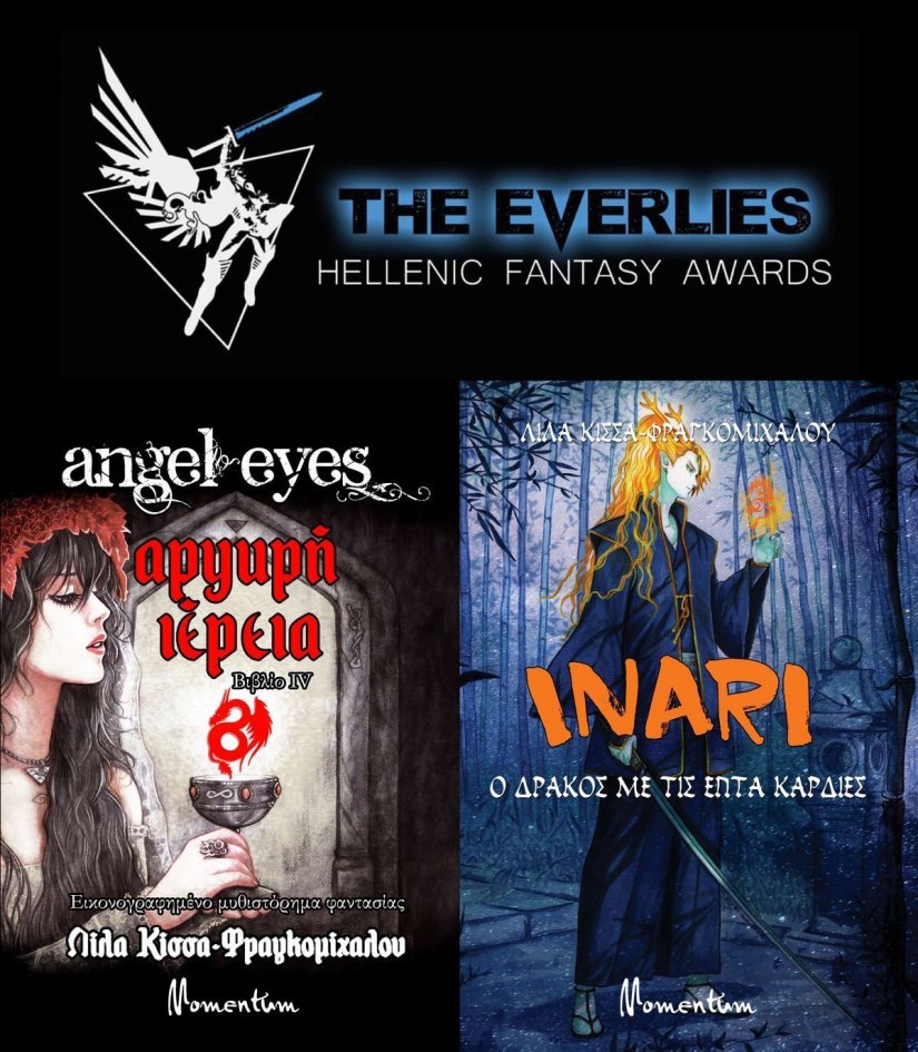 Η «Αργυρή Ιέρεια», το τέταρτο βιβλίο της σειράς εικονογραφημένου μυθιστορήματος Angel Eyes, αλλά και ο ιαπωνικής έμπνευσης μύθος «Ινάρι: ο Δράκος με τις Επτά Καρδιές», είναι υποψήφια σε δύο κατηγορίες για το 2019: 1) Καλύτερο βιβλίο φαντασίας από έλληνα συγγραφέα και 2) Καλύτερο εξώφυλλο.