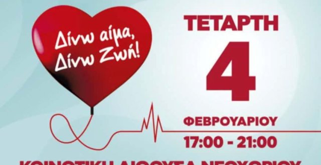 Η Νοσοκομειακή Υπηρεσία Αιμοδοσίας Χίου ενημερώνει ότι την Τετάρτη 4 Φεβρουαρίου θα πραγματοποιηθεί εθελοντική Αιμοδοσία με την υποστήριξη του Πολιτιστικού Επιμορφωτικού Συλλόγου Νεοχωρίου "Αγιος Μηνάς" στην Κοινοτική Αίθουσα Νεοχωρίου από τις 5.00 - 9.00 μ.μ.