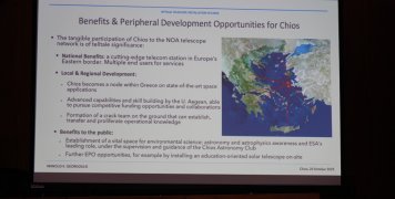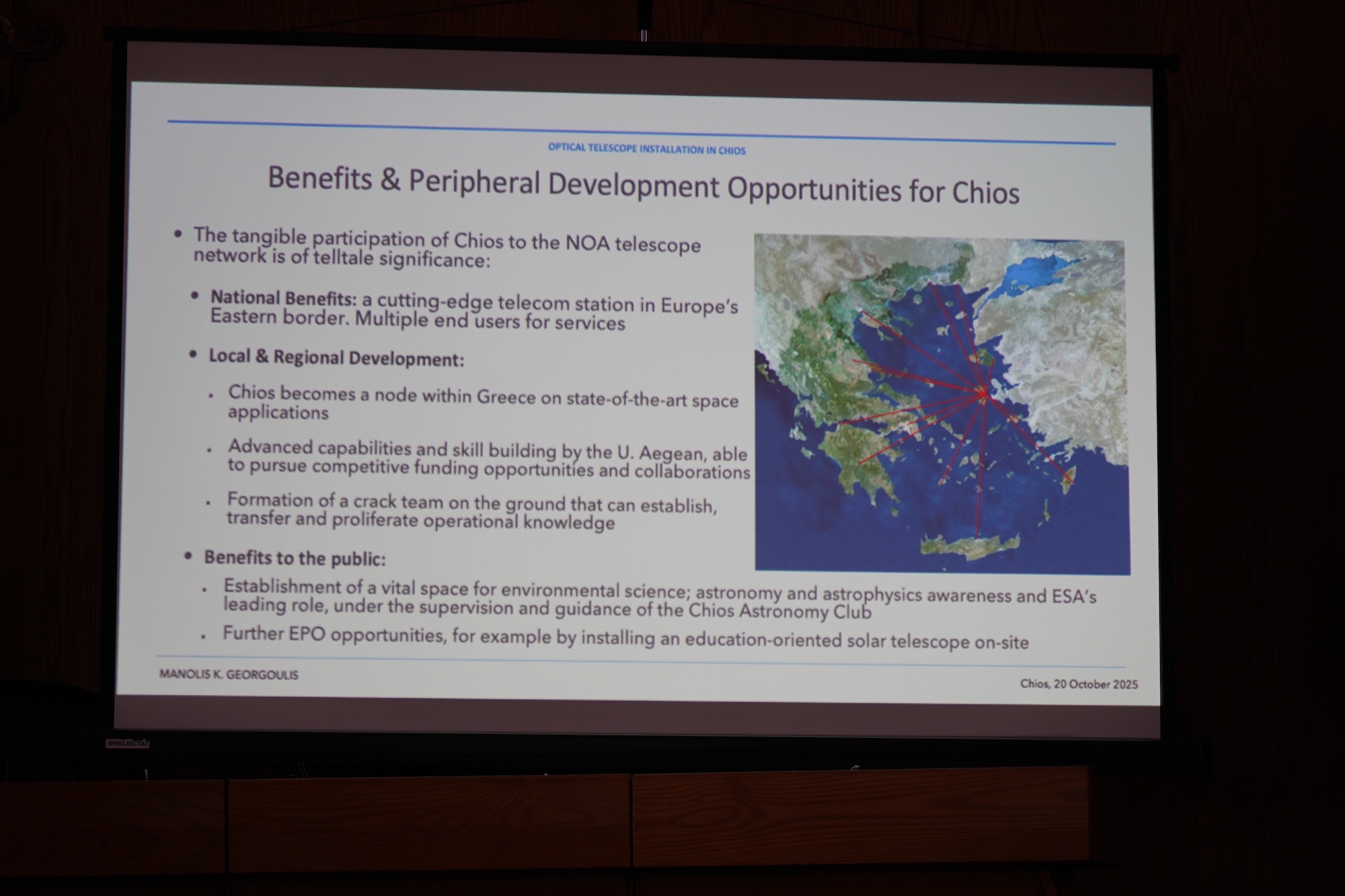 Το πρωί της Δευτέρας 20 Οκτωβρίου, στην αίθουσα συνεδριάσεων της Περιφερειακής Ενότητας Χίου, πραγματοποιήθηκε συνάντηση με αντικείμενο την ενημέρωση για την εξελίξεις αναφορικά με τη δημιουργία Κέντρου Παρατήρησης Εγγύς Διαστήματος Χίου -του γνωστού ως Αστεροσκοπείου- στην περιοχή «Αψιλές», στο Αίπος.