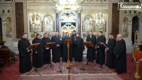 Πρωταγωνιστές δύο από τους καλλικέλαδους ψάλτες της Χίου ο Θοδωρής Καββάδας και ο Μίμης Σπύρος που ψέλνουν στην εκκλησία του Αγίου Ευστρατίου Θυμιανών.